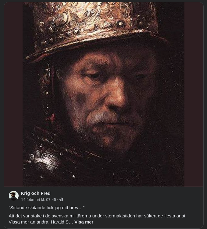 ”Sittande skitande fick jag ditt brev…” Att det var stake i de svenska militärerna under stormaktstiden har säkert de flesta anat. Vissa mer än andra, Harald Stake till exempel. Hans pappa var en Stake, hans mamma var en Posse och som ung adelsman kom Harald till hovet 1614. Redan som femtonåring tog han värvning och tillhörde den klick lovande officersämnen som skickades för militär träning till Nederländerna 1620. Efter hemkomsten gick karriären snabbt, ryttmästare 1629. Redan tidigt under den svenska invasionen av Tyskland under trettioåriga kriget, vid Burgstall sommaren 1631, hamnade Gustav II Adolf i ett utsatt läge. Harald Stake uppges ha räddat kungens liv och kom att ingå i gruppen kring krigarkungen det närmaste året. Karriären fortsatte spikrakt även efter att kungen stupat vid Lützen 1632; major 1634, överstelöjtnant 1635 och i april 1638 blev han överste och befälhavare över Västgöta kavalleriregemente. När svenskarna vände vapnen mot Danmark-Norge 1643 så förde Harald Stake befäl hemma i Sverige. I april uppges han och hans Västgöta ryttare haft ihjäl 700 snapphanar under en strid vid Hasslebro (utanför Höör i Skåne) den 16 april (tilläggas att det är de svenska siffrorna!). I oktober stred man på nytt vid Värplinge innan Stake beordrades norrut med sitt kavalleri. Harald Stake stred mycket framgångsrikt mot den norska invasionsstyrkan under slagen vid Landvetter i maj 1645, Gamlestaden och Ranängen 1645. Den danske befälhavaren Hannibal Sehestad var tvungen att avbryta sin operation mot Göteborg, Sveriges livsviktiga hamn mot väster. År 1657 var Sverige återigen i krig mot Danmark och den nu utnämnde generalmajor Stake sattes på hårda prov vid norska gränsen. Striderna är inte vidare omtalade i den svenska militärhistorien som i allmänhet följer kungen över isarna mot Köpenhamn. Icke desto mindre var kampen om Göta älvdalen en som icke fick förloras. Göteborg var fortfarande ett strategiskt och en handelsekonomisk knutpunkt för svenskarna och Stake lyckades. Freden i Roskilde innebar att Bohuslän övergick till svensk ägo och dess förste guvernör blev Harald Stake. Om de forna norrmännen i Bohuslän tyckte de nya herrarna var hårda och talade med dubbla tungor så hade de helt rätt, åtminstone var Harald Stake beträffar. Under en strid i Tyskland hade han fått käken genomskjuten och tungan sönderhuggen i två delar. Det var dock inget som hindrade honom för att med all kraft påbörja inlemmandet av Bohuslän i det svenska väldet. Det fanns problem som måste lösas, inte minst kom det en kunglig order 1669 ”att med all kraft utrota den trolldom som utspritts av trollfolk i länet”. Att det var stor fara bevisades inte minst av att de dömda skall ”levande på bål brännas”, extra grovt eftersom häxorna normalt halshöggs innan deras kroppar förvandlades till aska. 28 avrättades (andra dog under tortyr i fängelserna) innan man kunde känns sig säker igen. Med det var inte enbart fan som var lös. Danskarna förklarade åter krig, och den här gången såg det mörkt ut. Världens starkaste krigsfartyg Kronan välte och exploderade till synes oförklarligt (man hade nog inte fått tag i alla häxor trots allt) men danskarnas framgångar tog abrupt slut med slaget vid Lund 1676. Harald Stake mötte den norska invasionen vid Bohus fästning. På en uppmaning från den norske befälhavaren Ulrik Fredrik Gyldenløve att kapitulera och spara människoliv svarade Harald Stake – observera att Gyldenløve tillhörde danska kungafamiljen och sålunda skulle behandlas med högsta möjliga diplomatiska finess! Härvidlag misslyckades Stake. Grovt! Svaret löd: Sittande skitande fick jag ditt brev Ju mer jag läste, ju mer det drev Marken var bar, det fanns inte ett löv Jag tog ditt brev och torkade min röv! Eftersom denne värsting närmade sig de åttio och fick hjälpas upp och bindas fast vid sadeln när han ledde anfallen mot fienden fick han slutligen tillstånd att dra sig tillbaka i ett liv i lugn och ro på sina gods. Pensionärslivet är inte för alla. Harald Stake var död inom ett år. En annan anekdot som far runt i bygden är att Haralds fru Magdalena, född Sparre, en dag fick besök av en ung okänd flicka som bad att få låna fruns bröllopsklänning till sitt eget bröllop vilket fru Stake inte hade hjärta att neka. Vips var den unga flickan borta med klänning och allt och det förblev ett mysterium tills den plötsligt åter hängde på sin plats, ingen hade sett någon återlämna den och den var full med gnistrande ädelstenar och glimmande guld värda en förmögenhet. Bredvid hade älvan, för en älva var det, lagt en guldring belamrad med ädelstenar. En ring som bevarats i släkten i generationer. BILD: utsnitt av Rembrandts ”mannen med den gyllene hjälmen”. Denna text har tidigare publicerats på #Ofredsår, men då den är ett minne blott får den nytt liv här och nu. Stake är ingen man suddar ut ur historien så lätt.... #stormaktstiden#krigochfred