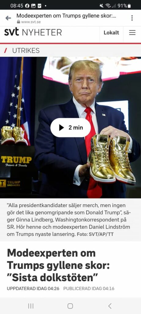 Trumps lansering av sina gyllene sneakers är bara en i mängden av hans souvenirer. Nu sågas de av entusiaster världen över. – Man kan tänka sig att det är den sista dolkstöten i en redan krisande bransch, säger Daniel Lindström som är modechef på tidningen Café. Uppvisningen kom dagen efter att Trump åkte på ett rekordskadestånd i ett civilrättsligt mål i New York, där hans organisation dömdes att betala 355 miljoner dollar. Lanseringen har fått flera modeprofiler att uttala sig. – Sneakerskulturen är officiellt över, skriver bland annat modeskaparen Shawn Stüssy på Instagram. ”Trodde det var ett aprilskämt” Till den brittiska tidningen The Guardian säger den tyska sneakerprofilen och modeentreprenören Hikmet Sugoer att han blev ”chockad” över att se Trump på mässan. – Jag trodde först att det var ett första aprilskämt. Sneakers bör förena snarare än att splittra, säger han. Enligt nyhetsbyrån AP var deltagarna på sneakermässan i Philadelphia unga och med olika bakgrund. En målgrupp som Trumpkampanjen vill nå. 1 000 par såldes slut Enligt CNN var skorna slutsålda samma kväll som de släpptes. Inledningsvis fanns bara 1 000 par till försäljning. På samma webbplats säljs också två billigare sneakers samt parfym.
