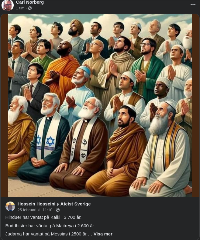 Hinduer har väntat på Kalki i 3 700 år. Buddhister har väntat på Maitreya i 2 600 år. Judarna har väntat på Messias i 2500 år. Kristna har väntat på Jesus i 2000 år. Sunnah väntar på profeten Issa i 1400 år. Muslimer har väntat på en messias från Muhammeds linje i 1300 år. Shiiter har väntat på Imam Mahdi i 1080 år. Druzer har väntat på Hamza ibn Ali i 1000 år. De flesta religioner antar idén om en "frälsare" och säger att världen kommer att förbli fylld av ondska tills denna frälsare kommer och fyller den med godhet och rättfärdighet. Kanske är vårt problem på den här planeten att människor förväntar sig att någon annan ska komma och lösa deras problem istället för att göra det själva.