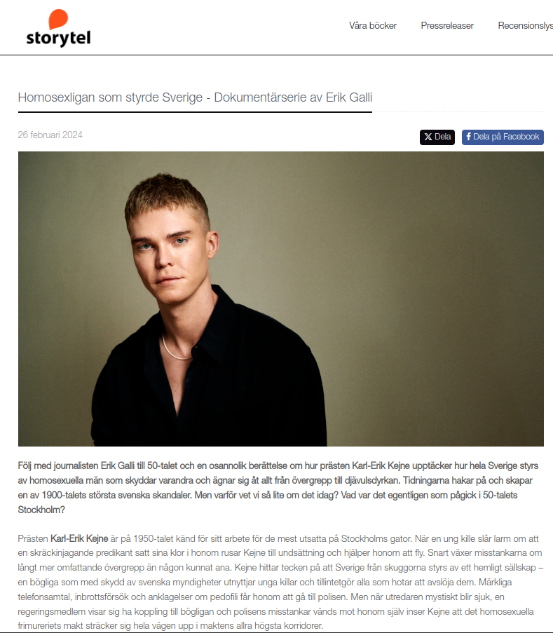 https://press.storytel.se/post/homosexligan-som-styrde-sverige-dokumentarserie-av-erik-galli "Följ med journalisten Erik Galli till 50-talet och en osannolik berättelse om hur prästen Karl-Erik Kejne upptäcker hur hela Sverige styrs av homosexuella män som skyddar varandra och ägnar sig åt allt från övergrepp till djävulsdyrkan. Tidningarna hakar på och skapar en av 1900-talets största svenska skandaler. Men varför vet vi så lite om det idag? Vad var det egentligen som pågick i 50-talets Stockholm? Prästen Karl-Erik Kejne är på 1950-talet känd för sitt arbete för de mest utsatta på Stockholms gator. När en ung kille slår larm om att en skräckinjagande predikant satt sina klor i honom rusar Kejne till undsättning och hjälper honom att fly. Snart växer misstankarna om långt mer omfattande övergrepp än någon kunnat ana. Kejne hittar tecken på att Sverige från skuggorna styrs av ett hemligt sällskap – en bögliga som med skydd av svenska myndigheter utnyttjar unga killar och tillintetgör alla som hotar att avslöja dem. Märkliga telefonsamtal, inbrottsförsök och anklagelser om pedofili får honom att gå till polisen. Men när utredaren mystiskt blir sjuk, en regeringsmedlem visar sig ha koppling till bögligan och polisens misstankar vänds mot honom själv inser Kejne att det homosexuella frimureriets makt sträcker sig hela vägen upp i maktens allra högsta korridorer. De svenska medierna var inte sena att haka på Kejnes skandalösa historier och Kejneaffären resulterade i otaliga löpsedlar under flera år, och till och med en ministeravgång. Erik Galli försöker här reda ut vad som verkligen hände och upptäcker under sitt arbete att allt inte är som det verkar, och många detaljer känns märkligt bekanta. Homosexligan är en dokumentär om hur hela Sverige slukades av en berättelse där ingen längre kunde skilja på verklighet och fantasi. Där de mest otroliga historier framfördes av en engagerad präst som ivrigt hejades på av medierna. Skulle något liknande kunna hända idag? Eller har det redan hänt? Erik Galli är journalist som bland annat gjort de uppmärksammade dokumentärerna Under kniven, pornfluencers och SD-bögar. – Vissa berättelser är så fängslande och osannolika att man inte tror på att de hänt. Det här är en sån berättelse. Den säger mycket om 50-talets Sverige och massmedier – men också om landet vi lever i idag, säger Erik Galli. Homosexligan som styrde Sverige är en dokumentär i fyra delar som släpps exklusivt på Storytel den 4 mars 2024. Förhandslyssning finns tillgängligt på förfrågan. "