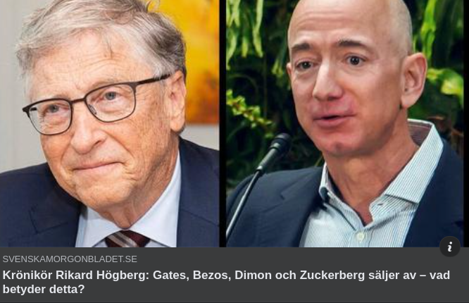 https://svenskamorgonbladet.se/2024/03/05/kronikor-rikard-hogberg-gates-bezos-dimon-och-zuckerberg-saljer-av-vad-betyder-detta/ "William Henry ”Bill” Gates III är medgrundare till Microsoft och arbetar nu vid Bill & Melinda Gates Foundation. Jeffrey Preston ”Jeff” Bezos är styrelseordförande och VD för Amazon.com. Jamie L. Dimon är styrelseordförande och VD för JPMorgan Chase & Co och Mark Elliot Zuckerberg är medgrundare av den sociala nätverkstjänsten Facebook och äger 28 procent av företaget. Nu säljer alla dessa aktörer av. Vad betyder detta? Detta betyder att USA:s börs står nu på sitt högsta läge och den kommer att sjunka. Rejält. Andra börser följer USA:s börs eftersom att de har samma ägare. Bill och Melinda Gates Foundation säljer av delar av sitt innehav i stiftelsen. Jeff Bezos säljer av för $8,5 miljarder USD av sina Amazon.com aktier. Jamie Dimon säljer av för $150 miljoner USD av sitt innehav av JPMorgan Chase & Co aktier. Mark Zuckerberg säljer av för $428 miljoner USD av sitt innehav i Meta. Vad betyder detta? Börsen har nått fram till sin topp. De personer som har kunskapen om hur läget är i dessa företag börjar att sälja av sina aktieinnehav och köper i stället andra värden. Jamie Dimon har under en lång tid talat ner Bitcoin-token och ondgjort sig över Bitcoin, men i hemlighet köpt stora Bitcoin-poster. Genom att tala negativt om Bitcoin kursen, så kan han köpa dessa till ett lägre pris."