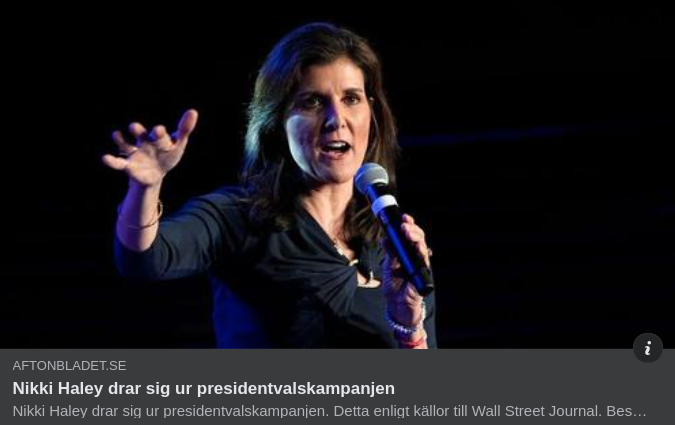 https://www.aftonbladet.se/nyheter/a/GMoK4B/nikki-haley-drar-sig-ur Den förra FN-ambassadören Nikki Haley hon uppge att hon drar sig ur i sitt tal på onsdagsmorgonen, enligt källor till Wall Street Journal. I supertisdagens valresultat tog hon endast hem segern i delstaten Vermont. Det var dock den enda delstaten där hon fick flest röster. Enligt de senaste mätningarna har hon endast stöd från 15 procent av de tillfrågade republikanska väljarna. Donald Trump som var favorittippad utropade sig själv till segrare under natten, innan valresultatet stod klart. Haley väntas hålla sitt tal klockan 16.00 svensk tid.