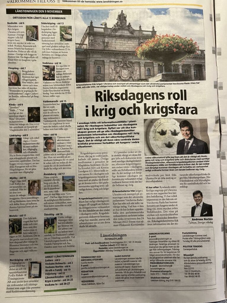 https://www.dagensjuridik.se/nyheter/riksdagen-har-ovat-krig/ "Krigsdelegationen, som kan ersätta riksdagen vid krig eller krigsfara, har genomfört en övning. Scenariot i övningen var ett väpnat angrepp och svåra samhällsstörningar. Krigsdelegationen som kan ersätta riksdagen ska regelbundet genomföra övningar med syfte att stärka förmågan att utöva det parlamentariska uppdraget även när Sverige är i krig och krigsfara. Scenariot i denna övning var ett väpnat angrepp och svåra samhällsstörningar. – Krigsdelegationen har övat på att upprätthålla den parlamentariska processen under svåra förhållanden. Övningen har gått bra och gett värdefull kunskap till krigsdelegationen, Riksdagsförvaltningen och övriga deltagare, säger Andreas Norlén, riksdagens talman och ordförande i krigsdelegationen i ett pressmeddelande. Övningen genomfördes i tillsammans med flera myndigheter, bland andra Regeringskansliet, Säkerhetspolisen, Polismyndigheten och Försvarsmakten. Krigsdelegationen träder inte automatiskt in Krigsdelegationen består av talmannen och 50 riksdagsledamöter. Ledamöterna väljs av riksdagen för varje mandatperiod. Krigsdelegationen träder inte automatiskt in i riksdagens ställe vid krig eller krigsfara. Det krävs ett aktivt beslut för att det ska ske och att förhållandena kräver att Krigsdelegationen ska träda in, alltså när riksdagen inte längre kan fungera. För ett beslut krävs att statsministern och sex av Utrikesnämndens ledamöter röstar för det."