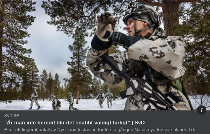 https://www.svd.se/a/RGJqPJ/nordic-response-sverige-centralt-i-storsta-natoovningen-pa-30-ar "Efter ett fingerat anfall av Ryssland testas nu för första gången Natos nya försvarsplaner. I den största Natoövningen sedan kalla kriget är Nordkalotten under attack – och Sverige är i centrum. Det har skett ett anfall mot norra Finland. Ryska soldater har attackerat och bland de snöklädda granarna pågår striderna för fullt. – Det ni ska få se är inte teater. Det här sker på riktigt, säger brigadgeneral Sami-Antti Takamaa. Han är den finländska arméns operationschef och står längst fram i den fullsatta buss som kör en grupp journalister rätt ut i skogen. Fast det är givetvis inte på riktigt och ska man vara nogräknad så är det inte ryssar som har invaderat. Det Takamaa talar om är den stora Natoövning vi strax ska bevittna där Ryssland döpts om till ”Occasus” – så gör Nato alltid för att inte skapa onödig friktion med Moskva. Men den fiende som nu bekämpas i de finländska skogarna har attackerat från öster. Och österut ligger bara ett land. 3 000 svenska soldater strider Smällen är öronbedövande. En finländsk Leopardstridsvagn har dragit fram, avlossar en granat och drar sig sedan lika snabbt tillbaka. Lite längre bort rycker nästa Leopard fram, skjuter, och så snabbt tillbaka. – Det gäller att verka utan att bli träffad. De åker fram och tillbaka, jobbar i stridsställning, förklarar Rickard Johansson som är befälhavare för de svenska trupperna. Logistik är en utmaning enligt brigadgeneral Rickard Johansson. Mat, ved och ammunition ska nå frontledet i nästan väglöst land. En Leopard i snön. Nordic Response genomförs så verklighetstroget som möjligt och samtliga soldater bor i fält. Övningen, som heter Nordic Response, ska hålla på till mitten av mars. I just den här delen strider 2 500 finländska soldater jämte 3 000 svenska och ett antal britter och fransmän. Men Nordic Response sträcker sig över hela Nordkalotten och totalt deltar 20 000 soldater från 13 länder. På land, till sjöss och i luften. Brigadgeneral Johansson pekar på ett svenskt stridsfordon 90, visar hur det blänker till i kanonröret och säger att de skjuter på fienden med laser, men att det används lös ammunition för att det ska låta verklighetstroget. Blir en fiendestridsvagn träffad slutar den fungera samtidigt som en saftblandare signalerar. Ökad rysk militär närvaro Att Nordic Response till stor del äger rum norr om polcirkeln handlar inte bara om att öva vinterkrig. Nästan rakt österut ligger ryska Kolahalvön och Murmansk, där president Vladimir Putin kraftigt låtit rusta upp och modernisera Norra flottan. Den är trots sitt namn långt mer än en ren flotta. Förutom de ökända kärnvapenbestyckade ubåtarna finns där såväl stridsflyg som markförband. Och till skillnad från övriga Ryssland, som dammsugits på soldater och vapen som skickats till Ukraina, har den militära närvaron runt Murmansk ökat. En viktig orsak är Arktis smältande isar. När istäcket – som tidigare skyddade Sibiriens gas- och oljefält – har luckrats upp, så har Putins Ryssland känt sig allt mer hotat. En känsla som säkerligen ökat med Sveriges och Finlands medlemskap i Nato, när de ryska Östersjöhamnarna i Kaliningrad och Sankt Petersburg nu helt omges av Natoländer. Vintern – den andra fienden Rickard Johansson poängterar att allt görs så realistiskt som möjligt. Soldaterna lever i fält och såväl försörjningslinjer som infrastruktur måste fungera. – Vi brukar säga att vintern är den andra fienden. Är man inte förberedd blir det snabbt väldigt farligt. Det här är en unik och svår terräng, säger Johansson och lägger till att vinterkrigföring är en färskvara som ständigt måste övas. Det är också något som Sverige, Finland och Norge är extremt bra på och kan lära övriga Natoländer. Den svenske befälhavaren förklarar varför just den allra nordligaste delen av Norden – Nordkalotten – är så viktig. För både Ryssland och Nato. – Zoomar man ut med ett strategiskt perspektiv ser man Kolahalvön. Man ser sjöförbindelserna hit upp och förmågan att föra trupp över Atlanten för att försvara den här delen av Europa. Runt omkring oss smäller och smattrar det när soldaterna i vinteruniformer rycker fram. Att det sker just i norra Finland är speciellt också ur ett annat perspektiv. Här har soldater skidat i skogarna förr. Fast under 1940-talets vinter- och fortsättningskrig var den ryska närvaron verklig. ”Hoppas det här är enda gången” ”Grillikioski” står det på skylten ovanför gatuköket inne i byn. Karolina och Kaija Kehus står och väntar på sina hamburgare och konstaterar att det är rätt kul att det händer något i trakten. – Här brukar vara rätt tyst, nu är det fullt med trafik, säger Karolina Kehus och pekar på andra sidan huvudgatan. Där står ett antal samiska kåtor uppställda, enbart för militärövningen. De säljer lokalt hantverk och grillat renkött. – Men jag hoppas att det här är enda gången. Att det inte kommer ryska soldater på riktigt, säger Kaija Kehus, som är mamma till Karolina. Hennes svenska är nästan perfekt trots att vi inte är i svenskbygder. Anledningen är just fortsättningskriget då Finland sökte hjälp hos Hitler och runt 200 000 tyska soldater stred på den finska sidan i Lappland. I Finlands vapenstillestånd med Sovjetunionen krävde Moskva att de tyska trupperna skulle kastas ut. Tyskarna svarade med att sätta hela byar i brand och invånarna flydde till Sverige. – En stor del av min släkt blev kvar i Sverige, så jag har varit där mycket, säger Kaija Kehus och pekar bort mot polishuset. Det enda av byns alla hus som inte brann upp. Dottern tar vid: – Det är klart att man tänker mycket på Ryssland. Vi har en lång gemensam gräns. När Vladimir Putin inledde sin fullskaliga i