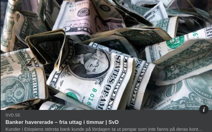 https://www.svd.se/a/69p8VL/banker-havererade-i-etiopien-fria-uttag-i-timmar "Kunder i Etiopiens största bank kunde på lördagen ta ut pengar som inte fanns på deras konton, rapporterar BBC. Banken försöker nu spåra uppskattningsvis en halv miljard kronor som togs ut under några timmar. Tidigt i lördags drabbades Commercial bank of Ethiopia (CBE) av ett tekniskt fel som gjorde det möjligt för kunder att ta ut mer pengar än vad som fanns på deras konton. Nyheten om de fria uttagen spred sig snabbt via sociala medier och uppskattningsvis över 40 miljoner dollar togs ut eller fördes över till andra konton innan felet kunde rättas till. Enligt representanter för banken gjordes en stor del av uttagen av studenter och ögonvittnen kunde berätta om långa köer till bankomater på universitetsområden runt om i Etiopien. En av studenterna berättar för BBC hur han fick veta från en kompis att det gick att ta ut stora summor från bankomaten, men även göra överföringar via bankens app. Uttagen ledde till att polis kallades till olika campus för att mota bort de köande studenterna. Etiopiens centralbank gick på söndagen ut med beskedet att ett tekniskt fel hade uppstått på CBE, där närmare 40 miljoner etiopier har konton. Centralbanken uppgav att felet hade uppstått under ett underhåll av bankens it-system. CBE:s ordförande Abe Sano uttalade sig om haveriet på måndagen. Han påpekade att uttagen som gjorts var små i jämförelse med bankens totala tillgångar, men ville inte specificera hur mycket som hade tagits ut under lördagsnatten. Uppgifter i lokala medier gjorde dock gällande att det handlade om mer än 40 miljoner dollar, motsvarande cirka 500 miljoner kronor. Åtminstone tre av landets universitet har, enligt BBC, gått ut med uppmaningar till sina studenter att lämna tillbaka pengar som tagits ut utan att det funnits täckning på kontot. CBE har i sin tur försäkrat att de kunder som har övertrasserat sina konton inte riskerar åtal, under förutsättning att de lämnar tillbaka pengarna till banken. Enligt BBC, som hänvisar till uppgifter i lokala medier, har representanter för CBE besökt ett antal av landets universitet för att inkassera pengar från studenter. Det är dock ännu oklart i vilken mån dessa ansträngningar varit framgångsrika."