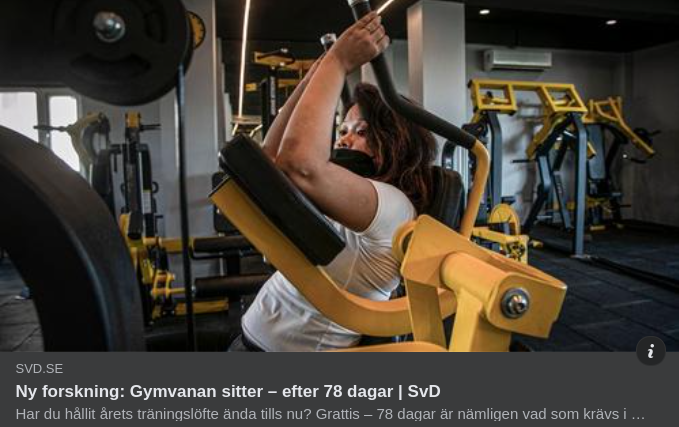 https://www.svd.se/a/Kndv4e/traningsforskning-fem-knep-for-att-skapa-en-bra-vana "Har du hållit årets träningslöfte ända tills nu? Grattis – 78 dagar är nämligen vad som krävs i snitt för att skapa en vana, enligt en ny studie. Och när vanan sitter är chansen god att vi fortsätter. Logiken tycks enkel. När vi får ny information och ny kunskap, då borde även vårt beteende förändras i linje med det. Vi slutar med det vi insett är dåligt för oss, och börjar göra det som är bra. Men vi agerar sällan logiskt. Som nybakad psykologiforskare slogs istället Wendy Wood av hur folk fortsatte att upprepa sina gamla beteenden – trots att de gick rakt emot deras nya insikter. – Bara för att människor blev övertygade om vad som var bra för dem så betydde inte det att deras handlingar förändrades, säger Wendy Wood, i dag professor i psykologi vid University of California och författare till boken ”Good Habits, bad habits”. Vanor sparar tid och kraft Istället fortsatte folk att äta skräpmat, struntade i att ha koll på pensionen, köpte gymkort utan att gå dit. Wendy Wood Wendy Wood Det var som att de saknade förmågan att styra sig själva. Och precis så verkar det vara. Men det är varken ineffektivt eller ologiskt, tvärt om så finns det en poäng med att göra som vi alltid har gjort. En vana är hjärnans sätt att spara tid och tankekraft. – En vana är en genväg i vårt beslutsfattande, den är vår bästa gissning för att nå ett lyckat resultat i en redan känd kontext, säger Wendy Wood. Autopilot 43 procent av dagen Hjärnan tar en mängd kognitiva genvägar för att spara energi. Vi dömer människor utifrån deras utseende, vi blir rädda för sånt som tidigare skadat oss – och vi gör en mängd aktiviteter utan att vi aktivt tänker på det: hur vi hälsar på någon, går över gatan eller äter en tårta. Sisådär 43 procent av vår vakna tid gör vi val helt på autopilot, sett till Woods studier. Hon kallar vanor ett inlärningssystem: vi återanvänder en aktivitet som tidigare, i samma kontext, har gett oss någon form av belöning – som att vi mådde bra, blev glada, eller bara att den funkade för det vi ville. Belöningen utlöser signalsubstansen dopamin – vilket gör att det minnet stärks. – Dopamin har flera uppgifter i hjärnan, och en är att hjälpa oss att skapa vaneminnen, att knyta ihop kontexten med det resultat du fick, säger Wendy Wood. När vi sedan är i en liknande situation igen, kommer vi automatiskt att bete oss på samma sätt, enligt Wood. Så förstärks vanan Redan på 1990-talet såg forskare vid MIT i USA i en rad experiment på möss att hjärnaktiviteten är lägre när vi gör något automatiskt. Forskarna placerade choklad på en specifik plats i en t-formad labyrint och släppte därefter in en mus. Samtidigt studerades musens hjärnaktivitet. Första gångerna som musen släpptes in, strosade den runt och upptäckte till slut chokladen. Efter några gånger gick musen direkt till den plats där chokladen fanns. Forskarna såg att hjärnaktiviteten minskade rejält när musen automatiskt gick direkt till chokladen. Samma sak verkar hända när vi människor gör något på automatik. Svårare skapa träningsvana Ju fler gånger vi gör något, desto mer tycks beteendet automatiseras. Kontexten behöver dessutom vara liknande varje gång, att aktiviteten är kopplad till något som påminner dig om att göra den. Det i sig är ett skäl till att det kan vara svårare att skapa en träningsvana, än att dricka ett glas vatten varje morgon. Men en träningsvana är vad forskare kallar ett komplext beteende, som är uppbyggt av flera olika aktiviteter: vi packar väskan, tar på oss ytterkläderna, går till bussen, åket till gymmet och så vidare. Hur lång tid tar det att etablera en träningsvana? 66 eller 78 dagar i snitt, beroende på studie. Hur lång tid tar det att etablera en träningsvana? 66 eller 78 dagar i snitt, beroende på studie. Foto: Johan Nilsson/TT Sådana är svårare att skapa en vana kring, men det handlar trots allt om flera rutinmässiga steg som också går att automatisera, enligt Wood. Och får du väl in det första steget, tycks det lättare att få med även de andra, menar hon. Rutin ökar chansen När vi väl börjat göra något på rutin, då är chansen också större att vi fortsätter. Men hur lång tid tar det att etablera en vana? Philippa Lally, psykologiforskare vid Surrey universitet, beslutade sig för att försöka få svar på den frågan. 96 deltagare fick välja en ät-, dryck- eller aktivitetsvana som de skulle skapa. Någon skulle äta en frukt varje dag, någon annan göra tio situps om dagen. De fick välja när aktiviteten skulle ske – i samband med något som påminde om att de skulle göra den. Då sitter vanan Under 12 veckor kämpade deltagarna på. Varje kväll svarade de på hur det gått och hur mycket de aktivt behövt tänka på att utföra aktiviteten eller om det skett i stort sett automatiskt. För varje deltagares svar gjordes Philippa Lally en graf. Den första tiden blev deltagarnas beteenden snabbt mer och mer automatiserade – sedan planade det ut. – Till en början ökade varje repetition automatiseringen rätt mycket, men sedan når man en peak. Och vid den peaken ansåg Lally att deltagarna hade skapat en vana. Repetitionerna därefter tycktes inte öka hur automatiskt aktiviteten utfördes. När vanan väl sitter, då sitter den, konstaterar hon. Men när deltagarna nådde sin peak skiljde sig åt. Rejält. Svårt att mäta aktivitet Lallys analys visade att det tog mellan 18 och 254 dagar innan en vana hade satt sig – och i snitt 66 dagar. Hon såg hon också att ju oftare en person utförde sin aktivitet, desto snabbare blev beteendet automatiserat. Lallys studie publicerades i European Journal of Social Psychology för närmare ett decennium sedan, men är fortfarande rätt unik i sitt slag och citeras of