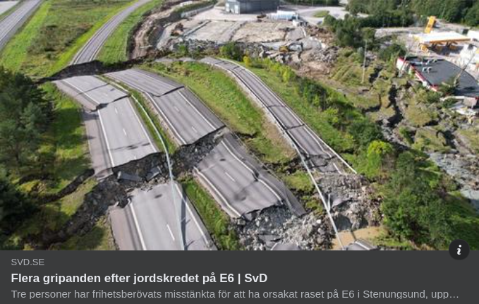 https://www.svd.se/a/P4W6Rb/tre-frihetsberovade-efter-skred-pa-e6 "Alla tre kopplas till byggarbetsplatsen i närheten av motorvägen. De är misstänkta för grov allmänfarlig vårdslöshet, grovt vållande till kroppsskada och otillåten miljöverksamhet. – Två av dem är gripna och den tredje är hämtad till förhör och inte formellt gripen än, säger chefsåklagare Daniel Veivo Pettersson. Han uppger att polis fortfarande arbetar med tillslagen, men han vill inte uppge om fler ska gripas. – Jag kan bekräfta att polisen har gjort ett antal husrannsakningar. Det är en pågående insats just nu så jag har inte möjlighet att berätta mer, säger Daniel Veivo Pettersson. Skredet, vid E6 i höjd med Stenungsund, inträffade natten mellan den 22 och 23 september förra året. Flera bilar och lastbilar samt en buss drabbades i skredet, som orsakade stora skador i landskapet. Tre personer skadades lindrigt. Vid byggarbetsplatsen pågick ett planerat bygge av en företagspark för industri, lager och kontor. Enligt medieuppgifter ska det i samband med bygget ha dumpats stora mängder schaktmassor i närheten av motorvägen, på mark som inte höll för belastningen. SVT Väst rapporterade i februari att det fanns avgörande fel i underlaget bakom bygget. Bland annat visade en karta, som påverkade bedömningen av skredrisken, att marken bestod av berg och därmed skulle tåla höga belastningar – något som inte stämde. De tre frihetsberövade kopplas till byggarbetsplatsen. Sedan raset har området varit avstängt och trafiken har fått ledas om. Tanken är dock att E6 ska kunna öppna igen under hösten. TT söker de berörda företagen."