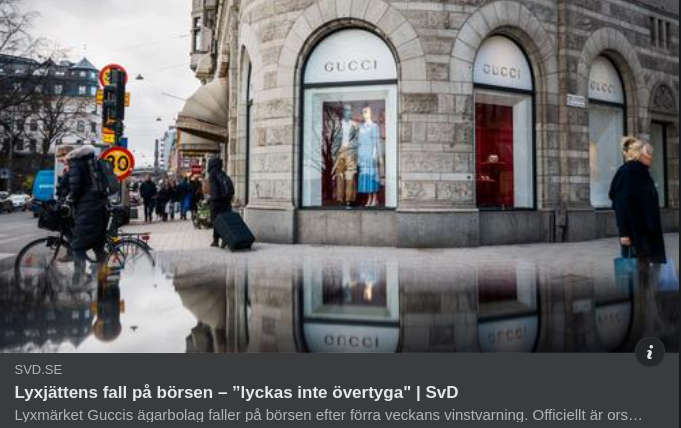 https://www.svd.se/a/2BRKpl/guccis-agare-kering-faller-pa-borsen-efter-vinstvarning "I Sverige har varumärket Gucci hamnat i offentligheten av andra skäl. Riksdagsledamoten Martin Melin (L) nämnde varumärket som en möjlig signal om gängkriminalitet som skulle kunna leda till visitation av polis. Ett uttalande som han senare ångrade. Cristofer Andersson säger till SvD att han tror att även Guccis koppling gängkriminalitet har påverkat bolagets utveckling negativt, även utanför Sverige. Luca Solca från Bernstein tonar å sin sida ned sambandet: ”I allmänhet tycker jag att det är rimligt att säga att rika kriminella gillar lyxmärken – som ett sätt att visa sin status. Ändå har vi inte funnit något speciellt samband mellan Gucci och kriminella.”