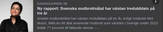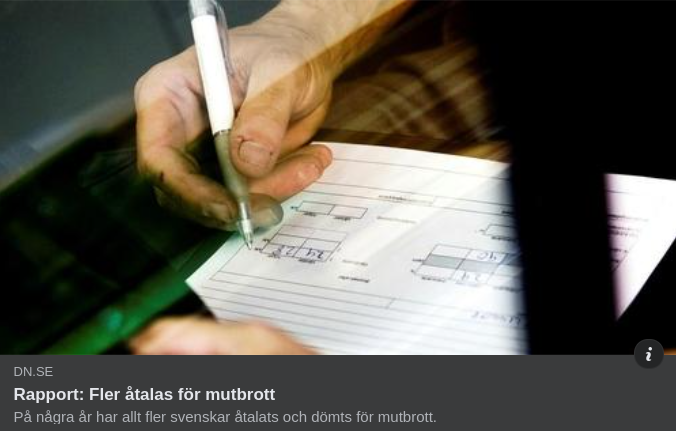 https://www.dn.se/sverige/rapport-fler-atalas-for-mutbrott/ "På några år har allt fler svenskar åtalats och dömts för mutbrott. Det visar en ny rapport från näringslivsorganisationen Institutet mot mutor. – Det är oroväckande att det finns så många unga bland de dömda, säger Parul Sharma, institutets tillförordnade generalsekreterare. Vid nio olika tillfällen tog en besiktningstekniker emot pengar från flera olika bilägare för att låta bilarna passera utan anmärkningar. Mannen dömdes för att ha tagit emot mutor. Flera bilägare dömdes för givande av muta till 60 dagsböter vardera. Fallet beskrivs i rapporten Mutbrottsdomar 2023. Den är gjord av Institutet mot mutor (IMM), som har gått igenom fjolårets åtal och domar om mutor. Rapporten visar att Åklagarmyndigheten väckte åtal i 96 fall om misstänkt mutbrott, där 77 procent ledde till fällande dom. Antalet åtal är en markant ökning jämfört med år 2020 då antalet åtal uppgick till 38. – Antalet åtal visar att medvetenheten kring frågor som rör mutor och korruption faktiskt ökar i samhället, säger Parul Sharma, tillförordnad generalsekreterare på IMM. De som ligger i topp i mutbrottslighet är transport- och fordonsrelaterade verksamheter. Nästan en tredjedel av fjolårets domar handlar om mutor inom exempelvis trafikskolor och bilbesiktningar. Under 2022 var det ordningsmakten som låg i topp, men de hamnar på en andra plats 2023 med sina åtta mutbrottsdomar. När pandemin bröt ut under 2020 var det vård och omsorg som låg i topp tillsammans med transport- och fordonsrelaterade verksamheter. Parul Sharma är tillförordnad generalsekreterare på IMM. ”Vi behöver ha många fler satsningar och kunskapsfrämjande insatser inom antikorruptionsfrågor”, säger hon. Parul Sharma är tillförordnad generalsekreterare på IMM. ”Vi behöver ha många fler satsningar och kunskapsfrämjande insatser inom antikorruptionsfrågor”, säger hon. Parul Sharma tror dock att det fortfarande finns ett stort mörkertal när det handlar om själva mutbrottet och hänvisar till olika stickprover som bland annat EU har gjort. – Ett är Eurobarometerns stickprov som visar att drygt hälften av svenskarna i den offentliga sektorn har erfarit eller bevittnat någon typ av muta eller korruption på sina arbetsplatser. Och det matchar inte utfallet av mutbrottsdomar, säger Parul Sharma. IMM har sedan 2017 undersökt mutbrottsdomar. Och det har alltid varit männen som dominerat som mutbrottslingar. Av de 74 åtal som lett till fällande domar under 2023 har den dömde nästan uteslutande varit en man. Rapporten visar att det är främst kontanter som gäller i mutbrotten. I flera domar som rapporten tar upp kan man läsa hur flertalet kriminalvårdare erbjudits stora summor för insmugglade telefoner och narkotika, men också för att posta brev från häktade personer som sitter med restriktioner. – En annan aspekt som jag tycker är oroväckande är att det finns så många unga bland de dömda, säger Parul Sharma. Fakta.Institutet mot mutor (IMM) IMM är en näringslivsorganisation som har funnits sedan 1923. Genom informations- och kunskapsspridning samt självreglering stöttar IMM proaktivt i antikorruptionsarbetet och bidrar till ökad medvetenhet om korruptionsfrågor i samhället. Rättsfallssamlingen från IMM har producerats sedan 2017 och ger en överblick över svenska mutbrottsdomar. Källa: IMM Åldersspridningen i fjolårets domar sträcker sig från 19 till 79 år. De flesta dömda finns i åldersgruppen 20-29 och 30-39, medan den genomsnittliga mutbrottslingen är 43 år. – Med djup oro känner jag att vi behöver ha många fler satsningar och kunskapsfrämjande insatser inom antikorruptionsfrågor, redan från skolan och upp till universitet, säger Parul Sharma. Hon menar också att grogrunden till mutor och korruption är organisationskulturer som tenderar att sopa saker under mattan eller tysta ned händelser. Parul Sharma vill ändå understryka att den mest riskfyllda sektorn för mutor och korruption är mötet mellan privat och offentlig sektor. – För 2023 och likaså för 2022 såg vi att över 80 procent av fallen skedde i mötet mellan privat sektor och offentlig sektor. Och gärna inom offentlig upphandling, säger hon."Mutor, mutor och mera mutor...