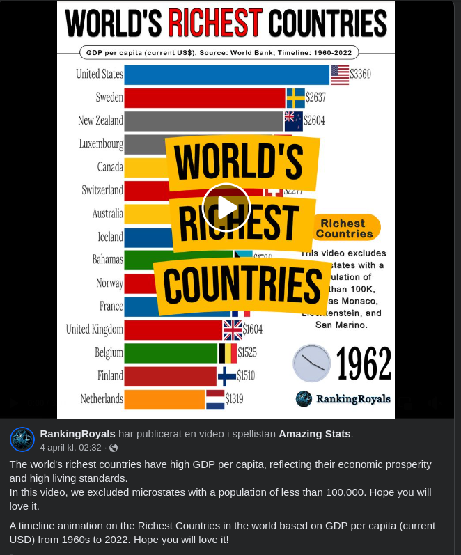https://www.facebook.com/carl.norberg.54/posts/960173335814194 Världens rikaste länder har hög BNP per capita, vilket speglar deras ekonomiska välstånd och höga levnadsstandard. I den här videon utesluter vi mikrostater med en befolkning på mindre än 100 000. Hoppas du kommer älska det. En tidslinjeanimation om de rikaste länderna i världen baserat på BNP per capita (nuvarande USD) från 1960-talet till 2022. Hoppas du kommer älska det!