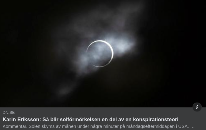 https://www.dn.se/varlden/karin-eriksson-sa-blir-solformorkelsen-en-del-av-en-konspirationsteori/ "Solen skyms av månen under några minuter på måndagseftermiddagen i USA. Det politiska mörkret blir svårare att skingra. Nu är till och med solförmörkelsen en del av extremhögerns konspirationsteorier. På måndag kommer månen långsamt att glida in framför solen och blockera dagsljuset i delar av Mexiko, USA och Kanada. Det är andra gången på kort tid som den amerikanska kontinenten upplever ett spektakulärt himlafenomen. För ett halvår sedan bländades miljontals amerikaner av en eldring runt solen, en ringformad solförmörkelse. Myndigheterna i USA förväntar sig stora skaror av besökare längs en bana från Texas i sydväst till New Hampshire och Maine i nordost. En solförmörkelse är ett välkänt fenomen, fullt möjligt att förutsäga och förklara. Vi vet redan nu att det kommer att dröja till 2126 till nästa totala solförmörkelse i Skandinavien. Ändå frodas konspirationsteorier och domedagsprofetior i USA. En del varnar för apokalypsen, komplett med terrorattacker, biologiska stridsmedel och reaktorhaverier på kärnkraftverk. Jesus ska återvända och USA ska styra världen. I viss mån är det samma tongångar som vid den förra stora solförmörkelsen i USA år 2017. Kanske har pandemin och krigen bidragit till rädslan för världens undergång. En studie från från Pew Research från december 2022 visar att en klar majoritet av medlemmarna i svarta kyrkor och väckelsekristna församlingar i USA tror att vi lever i den yttersta tiden. Men måndagens solförmörkelse har också blivit en del av den politiska propagandan detta valår i USA. Bland andra försöker Alex Jones, mannen bakom den högerradikala webbplatsen Infowars, sprida myten om en stor sammansvärjning i staten. Myndigheter i flera delstater och städer har valt att utlysa nödläge före solförmörkelsen, eftersom man förväntar sig att det till exempel blir stora trafikstockningar och störningar i mobilnäten. Enligt Jones är detta bara ”en generalrepetition”. Han hävdar att makthavarna utnyttjar månens bana för att öva på undantagstillståndet som ska utlysas om Donald Trump vinner presidentvalet i november. Han hävdar att Bidenadministrationen tänker utnyttja medborgarnas vidskeplighet för att skrämma upp folk. Det var Trumps allierade – Alex Jones kompisar – som lekte med tanken om att utlysa undantagstillstånd efter valet 2020. Radioprataren är bland annat känd för att ha spridit grova lögner om terrorattentatet den 11 september 2001 och skolskjutningen på Sandy Hook i Connecticut i december 2012. Men Alex Jones är inte bara en knasboll i amerikansk politik. Han är en av alla dessa radiopratare från den yttersta högern som banat väg för Donald Trump. Han var med och mobiliserade Trumpanhängarna inför protesten som urartade i stormningen av Kapitolium den 6 januari 2021. Han siktades utanför kongressen ihop med Trumpadvokaten Kenneth Chesebro, som låg bakom idén om att undergräva Bidens valseger genom att skicka falska elektorer till Washington. Solljuset återvänder till den amerikanska kontinenten på måndagseftermiddagen. Den politiska skymningen – den kan nog bestå. Fakta.Solförmörkelsen ● En solförmörkelse uppstår när månen passerar mellan solen och jorden. Under några minuter blockeras nästan allt solljus från att nå jorden – mitt på ljusa dagen. Månens diameter är bara en 400-del av solens diameter, men månen ligger så pass nära jorden att den ändå ser lika stor ut på vår himmel. Vid en total solförmörkelse ser det ut som att en skiva täcker över en del av solen tills den täcker över hela solen. ● Solförmörkelsen den 8 april kommer att synas på en bana på den amerikanska kontinenten, från Mazatlan i Mexiko i sydväst till Newfoundland i Kanada i nordost, via amerikanska städer som Dallas, Indianapolis, Cleveland, Toronto och Montreal."