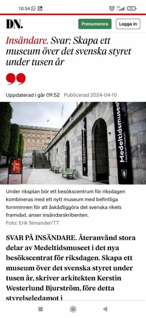 https://www.dn.se/insandare/svar-skapa-ett-museum-over-det-svenska-styret-under-tusen-ar/ I insändare i DN den 13/3 skrev Gösta Alfvén, Birgitta Palmertz och Richard Murray i arbetsgruppen Rädda Medeltidsmuseet att riksdagens utredningsdirektiv avseende Medeltidsmuseet har ändrats från beslutet 14/2 till att ”det ska skapas en ny medeltidsutställning med modern utställningsteknik och en suggestiv och intresseväckande medeltida miljö liknande den som funnits”. Budskapet från arbetsgruppen är: ”Huvuddelen av det nuvarande museet bör kunna behållas och utgöra basen för ett nytt museum.” Detta är vad de flesta nu hoppas ska få bli kvar under Riksplan. Men att arbetsgruppen nu så ensidigt fokuserar på den ena partens skuld blir i längden kontraproduktivt. Hade Stockholms stad som ”ägare” av Stockholms stadsmuseum och därmed också av Medeltidsmuseet ställts till svars skulle det vara betydligt enklare för riksdagen att stå kvar vid tidigare beslut med bevarad museal gestaltning av fornfynden. Stockholms stad har undgått kritik, trots att staden tidigt tagit ställning för att flytta museet utan att ens närmast ansvarig kulturhistorisk specialistkompetens hos Medeltidsmuseet har varit engagerad i att påverka riksdagens beslut. Dess dåvarande chef sade upp sig i protest. Bekymrade politiker har berättat att staden åtminstone redan 2017 hanterade museifrågan på hög tjänstemannanivå. Tystnaden kring förberedelsearbetet inom stadsförvaltningen 2020–2021 och framöver är mångomvittnad. Enda undantaget var ett av få uppmärksammat pressmeddelande 16/12 2021 om flytten av museet och om att planeringen av hur de nya lokalerna i Börshuset ska användas skulle påbörjas. Denna har sedan dess bedrivits av den för ändamålet därefter nyanställda museichefen. Direkta frågor inför det slutliga beslutet om stängning till stadens kulturborgarråd och ansvariga tjänstemän i stadsförvaltningen besvarades med fördelarna med modern utställningsteknik framför besökarnas möte med fornfynden på plats. Inte ens att Riddarholmsskeppet måste delas på mitten för att få plats och att ny forskning gjort det än mer intressant har beklagats. Stockholms stad bär ett särskilt ansvar eftersom staden är den part i hyresavtalet med riksdagen som genom Medeltidsmuseet har den kulturhistoriska kompetensen och för att museet byggdes för att visa de nationellt så betydelsefulla fornfynden. Att Stockholms stad, som huvudman för Medeltidsmuseet lät bli att med hjälp av företrädare för vetenskap, profession och allmänhet med hävda betydelsen av museet var ansvarslöst. Finansborgarrådet Karin Wanngård (S), stadsdirektören Fredrik Jurdell och kulturnämndens ordförande Torun Boucher (V) har mycket att förklara. Stockholms stads ”nej tack” var en missräkning för många. Men det ger i gengäld bättre utrymme för riksdagen att i linje med sitt uppdrag och med avstamp från fornfynden och befintlig gestaltning av medeltida företeelser och liv, utveckla ett museum med iscensättning av det svenska styrets väg till demokrati. Att med hjälp av anpassade besökstider och varierande ljussättning kunna använda detta som både besökscenter och museum vore i dagsläget inget konstigt, om det inte finns plats nog att separera dessa funktioner. Att museiscenografin ”från kyrka till galgbacke”, vid behov uppdaterad och kompletterad med modern utställningsteknik och att Riddarholmsskeppet, tillsammans med de övriga fornfynden av nationell betydelse, finns med är avgörande för upplevelsen av dessa och för förståelsen av den berättelse om Sverige som de förmedlar. Lika viktig är den för att det stora antalet besökare i längden ska hitta till museet. Det minsta som vi medborgare har orsak att begära av Stockholms stad är att scenografin och Riddarholmsskeppet ska finnas på plats i gott skick under Riksplan så att de kan användas i riksdagens nya museum där. För att det nationella perspektivet på fornfynden ska komma till sin rätt vore den naturliga samarbetspartnern för riksdagen myndigheten Statens historiska museer med dess historiska, försvarshistoriska, sjöhistoriska med flera museer. Nu ligger huvudansvaret på riksdagen att ta till vara den stora potentialen hos de så betydelsefulla och med befintlig scenografi så genialt iscensatta fornminnena under Riksplan. Greppa tillfället att ta täten genom att utveckla ett museum, tillika besökscenter, över det svenska styret under tusen år. Vad vore i dagsläget klokare än återbruk av väsentliga delar av ett unikt engagerande, spännande och älskat museum över hur vi kommit dit vi nu är?