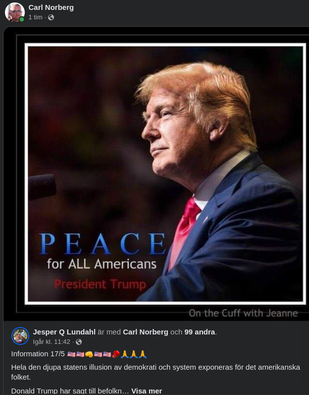 Information 17/5 Hela den djupa statens illusion av demokrati och system exponeras för det amerikanska folket. Donald Trump har sagt till befolkningen. Jag vill att ni ser hur den djupa staten förstör det här landet. Hur de öppnar gränsen och släpper in alla illegala invandrare, hur de förstör ekonomin och förändrar den utifrån the Green New Deal. Jag vill att ni ser hur den djupa statens rättvisa är, hur deras sätt att agera utifrån lagen skiljer sig markant från hur lagen är skriven. Deras rättvisa skyddar den djupa statens system, men den skyddar inte det amerikanska folket. Dessutom hur de försöker ta bort alla rättigheter och inskränker allas frihet. Donald Trump vill också visa att den djupa staten är beredda att sätta sin största politiske opponent i fängelse, trots att det inte finns något brott begånget. Nu har vi kommit dithän där resan kommer att bli mer än guppig. Vi färdas genom stormen och befolkningen kommer att se hur elaka, hur fruktansvärda den djupa statens drägg är. Sanningen är oundviklig. Den juridiska kommittén i kongressen kräver återigen, att den inspelning som gjordes då Special Counsel Robert Hur samtalade med Joe Biden, lämnas över till kommittén. Justitiedepartementet påstår att, efter alla påstötningar som den juridiska kommittén gjort i detta ärende, så finns det ett exekutivt privilegium som säger att de inte ska behöva lämna över inspelningen till kongressen. Att ha Exekutivt Privilegium har Donald Trump anklagades för att han använder sig av. Det är detta som Jack Smith försöker få till stånd att Högsta domstolen tar bort. Nu använder Bidenadministrationen sig av samma privilegium och då är det rätt och riktigt. Det visar på den tudelade rättvisan. Det intressanta i detta ärende är att flera tidningar och nyhetsredaktioner skrivit under en stämningsansökan mot Justitiedepartementet, där de kräver att få ta del av inspelningen mellan Hur och Biden. De är ABC, AP, Bloomberg, CBS, CNN, WSJ, NBC, Reuters och Washington Post. Den övergripande kommittén ordförande James Comer har funnit ytterligare ett bankkonto som tillhör familjen Biden. Comer har redan funnit 24 miljoner dollar på olika bankkonton som tillhör familjen. Vi kan räkna med att det slutliga beloppet som man finner i familjen Bidens ägo, är betydligt högre än de nämnda 24 miljonerna. Stella Assange sade vid en pressträff att till veckan ska det avgöras om Julian Assange kommer att släppas fri. Det är upp till en brittisk domstol att besluta om det. Helt plötsligt säger Joe Biden att han har en exekutiv order som säger, att han kan stänga gränsen om det är fler än 4.000 illegala invandrare som passerar över gränsen per dag. Det har säkert att göra med presidentvalet, som han och demokraterna är på väg att förlora. Nu försöker han locka tillbaka väljare med detta. När demokrater och även korrupta republikaner lägger sina röster, kan vi se att de tillhör den djupa staten. Den demokratiska guvernören i Kansas, Laura Kelly, satte stopp för förslaget om att inte tillåta utländska intressen köpa mark nära militära baser. EU visar verkligen upp vilka de är. De vill kriminalisera talen om migration. Att kritisera migrationen blir nu hate-speech. Media som skriver om migrationen kan stängas ned. Genom att kalla illegala invandrare för vad de är, att ekonomin körs i botten, att migrationen är alldeles för hög och mycket annat, är hate-speech. Det förbjuds och det är så här de kommer att kontrollera vad var och en säger Men världen förändras till det positiva. Först El Salvador, sedan Argentina och nu Nederländerna. Geert Wilders, den nye premiärministern, har deklarerat den striktaste asylpolitiken någonsin. Illegala invandrare kommer att deporteras med kraftfulla åtgärder. Han stoppar den tänkta utvecklingen och övertagandet av landet av invandrarna. Det ser ut som det är tänkt att polis och militär kommer att gripa alla invandrare och sparka ut dem ur landet. Det här är inget EU kommer att gilla. Men vi som ser positivt på vad som kommer att hända, kommer att se att alla invandrare blir återförda till det land varifrån de kommer. Nederländerna kommer åter att blomstra. Det här kommer att följas av andra länder. Putin har anlänt till Beijing för ett möte med Xi Jingping. I Ukraina är man så desperata, att de kidnappar män som är tillsammans med familjen, fru och barn, för att sändas till fronten och en säker död. “Det här är den demokrati som de svenska politikerna talar om, den demokrati de ställer sig bakom. Det är minst sagt skrämmande.” I Niger har Bidens sändebud kommit helt på tvärs med Nigers premiärminister. Hon hotar och säger att de amerikanska trupperna ska vara kvar på baserna. Premiärministern säger att det bara är att flytta ut och ta med er all utrustning och åka hem, för de ryska trupperna kommer att ersätta de amerikanska. USA har förlorat en flygbas som kostat minst 100 miljoner dollar. Den tas över av ryssarna. Återigen har Biden ställt till det för USA och förlorat. WHOs fördrag är egentligen en överenskommelse. Ett fördrag behöver en underskrift av USAs president plus två-tredjedelars majoritet i senaten. En överenskommelse behöver bara presidentens underskrift. Är det en överenskommelse, så går det att gå ut ur den längre fram. Allt omkring transrörelsen är så känsligt, vad människor ska få tycka att, det normala blir det onormala. I USA talar man gärna om att en stark familj med starka familjeband är vad USA bygger på. När så en NFL spelare höll ett tal vid examen för ett antal studenter i ett college i Kansas, om vikten att ha en riktigt bra familj med starka band, så blev han avskedad av lagledningen i Kansas Citys NFL-lag. Det kommer fram att de demonstrerande vid campus runt om i USA inte hade Palestina för gott, utan de har spridit Hamas-propaganda. D