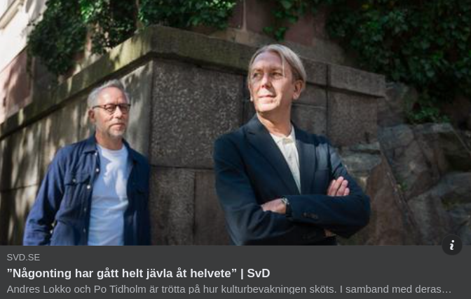 https://www.svd.se/a/wgPGMG/tidholm-lokko-nagonting-har-gatt-helt-javla-at-helvete "Det är ett personangrepp. Det känns i alla fall så, när jag läser om Andres Lokkos och Po Tidholms evenemang ”Korståget mot kulturen”. Under tre kvällar ska de två musikkritikerna – Lokko i SvD och Tidholm i DN, försöka förstå varför Sveriges kulturbevakning bland annat är överdrivet fixerad vid Taylor Swift och ”Love is blind”. Jag är förvisso inte omnämnd, men eftersom jag skrivit flera texter om både Taylor Swift och ”Love is blind” behövdes det knappast. ”Korståget mot kulturen – med Lokko och Tidholm” Andres Lokkos och Po Tidholms samtalsserie ”Korståget mot kulturen” äger rum 21, 22 och 23 maj på Kulturhuset Stadsteatern i Stockholm. Till sin hjälp har de bjudit in olika gäster – Clemens Poellinger, Ulrika Knutson, Martin Aagård, Saga Cavallin, Annina Rabe och SvD:s Elsa Westerstad medverkar under de olika kvällarna. Det är inte en kul insikt, den att två 1960- och 70-talister är så missnöjda med min generation Z och våra arbetsinsatser att de är redo att bedriva ett korståg mot dem. Så vad tycker Lokko och Tidholm att ska vi göra för att rädda detta sjunkande skepp som de menar är kultursidorna? Jag går en journalistisk fortbildning. Lokko: ”Grundproblemet ligger i det du just beskriver. Vi har just haft en månad eller två av ’Mello’, följt av en månad Taylor Swift-feber. Sen följs det av Bruce Springsteen, gissningsvis. Sen får alla kulturjournalister dåligt samvete av att verka i ett sådant hamsterhjul, och så gör de en katolsk botgöring med jämna mellanrum. Så som du gör nu Andreas, och som vi själva säkert också gör med vår protest. Sen fortsätter det som vanligt igen.” Tidholm: ”Man är ju intvingad i den här medieekonomin. Det har blivit värre sen tidningen blev en läsaraffär. För 20 år sedan bekostades tidningen av annonser, i dag är det läsarnas prenumerationsavgifter. Det gör att tidningarna graviterar mot att bara skriva sånt som många tycker om och läser. Då hamnar vi i läsarnas gisslan, allihopa. Sen har media drabbats av så dåligt självförtroende. Den här grejen som Andres håller på med, att uppfostra läsekretsen är man ju också livrädd för.” Lokko: ”Jag folkbildar..!” Hela första kvällen kretsar kring 1990-talet. Ground zero. Lokko beskriver decenniet som en sista journalistisk frizon, en tid präglad av vad Stig Larsson kallade ”objektiv kvalitet” och den grupp experter som avgjorde vad som hade det och inte. Både Tidholm och Lokko ingick i den grupp yngre förmågor som ville se till att framför allt popmusiken skulle tas på allvar på de annars klassiskt- och möjligen jazztunga sidorna. Och så hamnade vi här. Lokko: ”När vi så att säga vann och fick tillträde, vi som tog musik på allvar på samma sätt som man tog expressionistisk poesi, så dröjde det inte många sekunder innan detta förvandlades till ”Mello”. Jag förstod inte ens hur det gick till, det gick över en natt. Och sen åkte vi ut igen.” Den andra kvällen handlar om ”Hierarkierna”, hur olika uttrycksformer och ämnen rangordnas i det kulturella samtalet, och hur det svenska kulturlivet, enligt Lokko/Tidholm bara blivit en enda ”monokultur”. Lokko förklarar att vi svenskar är vana vid ett sådant monokulturellt ideal. Han pratar om Per Albin Hanssons folkhem, Ikea, HM, Spotify, Volvo och Ingrosso. Jag gör mitt bästa för att få en syl i vädret. Det är inte lätt. Jag säger något om att en kultursida inte längre kan ha den rollen, där man på ett lite uppläxande vis berättar för folk vad som är bäst och vad de egentligen borde läsa eller lyssna på. I första hand upptäcker folk kultur på egen hand, via sociala medier eller Spotify-algoritmer. Är det inte rimligare att försöka skriva om det som läsarna faktiskt tänker på och tar del av? Lokko: ”Men vill man vara den 24:e personen som bidrar med sin åsikt om ’Love is blind’ eller ’Game of thrones’? Eller vill man försöka erbjuda ett alternativ? Det handlar inte om att vara uppfostrande och elitistisk. Vi undrar bara vart alternativet tog vägen. Hur skapades en monokultur, där inget som inte är familjen Ingrosso/Wahlgren, Swift och Edward Blom är värt att skriva om?” Men nu hårdrar du det väl en aning. Det finns ju massor som inte är på det sätt du beskriver. Du får dessutom regelbundet skriva om i princip vad du vill, Andres. Och Po, senast häromdagen recenserade du ju exempelvis Nils Berg Cinemascopes nya skiva. Tidholm: ”Ja, det är verkligen inte synd om mig eller Andres. Jag tycker i alla fall inte synd om dig, Andres.” Snarare menar Po Tidholm att han gynnats mycket av 1990-talets tidsanda. Redaktionerna befolkades då av rätt ålderstigna typer som insåg att de hade blivit omsprungna av samtiden och öppnade således portarna för de yngre, hungriga skribenterna. Dessa personer blev ”enablers”, menar Tidholm. Tidholm: ”Min bild av 1940-talisterna är att de totalt retirerade inför samtiden. De var överdrivet okritiska och välkomnande på ett sätt som gjorde att det gick överstyr.” Vill man vara elak mot er kan man också säga att det låter som att ni är sura över att folk inte längre gillar samma saker som ni. Tidholm: ”Nej, kan man det..? Jag är lite avundsjuk på Andres som har sin kolumn och sin frihet att skriva mycket om smala saker, men jag gör mycket annat som jag vill. Och en sak som jag verkligen tror förenar mig och Andres är att vi inte känner oss det minsta nostalgiska.” Jag uppfattar nog er som lite nostalgiska. Ständigt detta 1990-tal. Att ni talar om 1990 är som om någon 1990 tjatat på er om 1954. Tidholm: ”Ska man hålla på med kultur måste man göra det med övertygelsen att det bästa inte är gjort än. Förbryllande många människor verkar tycka att allt som är bra redan är gjort. Vart ha