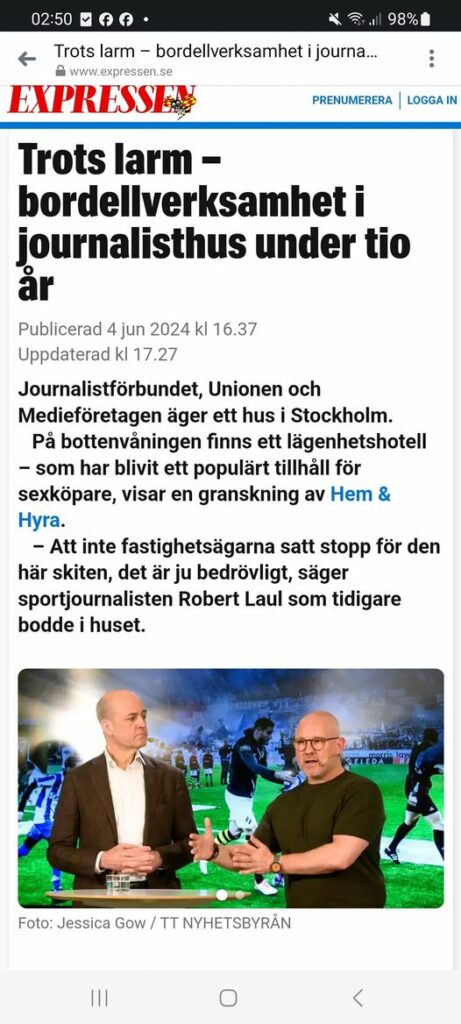 "Tiovåningshuset i Solna ägs av PP Pension, mediebranschens pensionsförening. Huvudmän är Journalistförbundet, Unionen och Medieföretagen, varav de två förstnämnda har representanter i styrelsen. 2015 hyrde ett företag som hyr ut lägenhetshotell in sig på bottenvåningen i huset. Sedan dess har huset förvandlats till en bordellverksamhet och blivit ett populärt tillhåll för sexköpare, enligt Hem & Hyra. 19 fall Tidningen har hittat totalt 19 fall av anmälda eller konstaterade fall av sexköp eller koppleri på lägenhetshotellet mellan 2015 och 2024. Så sent som i veckan dömdes en man för försök till sexköp i en av lägenheterna, enligt Hem & Hyra. I andra delar av huset bor journalister och kulturarbetare, som fått tillgång till bostäderna via en intern bostadskö. Flera boende har fattat misstankar om vad som pågår på bottenvåningen och slagit larm, men trots det har inga åtgärder vidtagits och verksamheten fortsatt. På frågan varför PP Pension inte sagt upp avtalet med företaget svarar vd:n Kjell Norling att föreningen anmält de larm som kommit in till polisen. De har dock inte fått tillräckliga bevis för att det faktiskt pågår prostitution på lägenhetshotellet för att säga upp avtalet, hävdar han. – Om det är så är det otroligt. Vi har ju nolltolerans mot sådant här. Men vi måste ändå ha bevisning. Vi kan inte anklaga någon för prostitution utan ha bevisning. Och den bevisningen ska ju polisen stå för, säger han till Hem & Hyra. SVT-profilen: En mardröm Sportjournalisten Robert Laul, som tidigare bodde i huset, tycker att det är ”bedrövligt” att fastighetsägaren inte har agerat. – Att inte fastighetsägarna satt stopp för den här skiten, det är ju bedrövligt, säger han till tidningen. Journalisten Linus Fremin, mest känd som tv-kritiker i SVT:s Morgonstudion, är också kritisk. Han bor fortfarande kvar i huset. – När jag vaknade i morse tänkte jag först att allt varit en mardröm. Men så var det inte, säger Linus Fremin till Hem & Hyra."