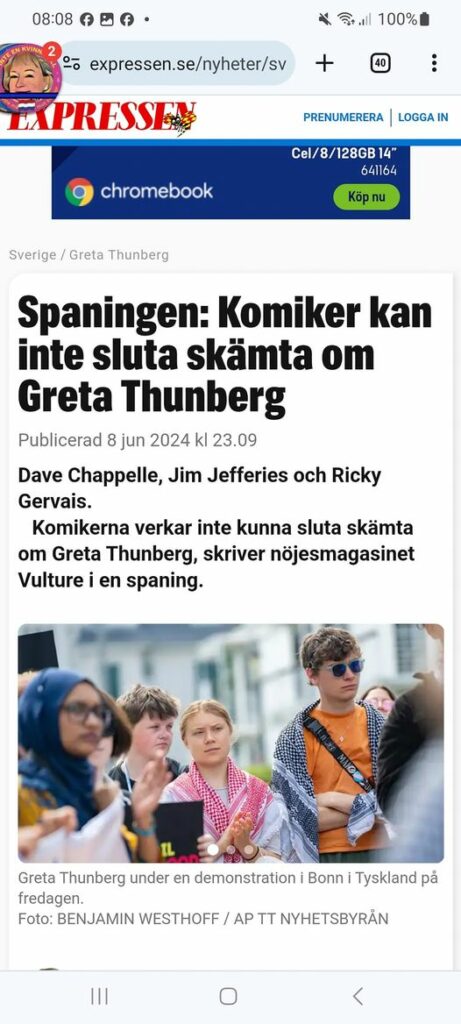 Det började 2019. Då seglade Greta Thunberg – som redan hade skapat rubriker världen över med sitt Fridays for future – till USA, för att i september delta på FN:s klimattoppmöte i New York. Där höll hon sitt uppmärksammade tal ”How dare you”. Ett tal som fick USA:s dåvarande president Donald Trump att kommentera den svenska klimataktivisten. Senare samma år utsågs Greta Thunberg till ”årets person” av magasinet Time. Blev hackkyckling efter FN-tal I och med det gick hon från att vara ”en tonåring som verkar för en god sak till en splittrande person i ett pågående kulturkrig”, skriver Vultures Hershal Pandya – och frågar sig sen om Greta Thunberg kan vara den person som har gett upphov till flest standup-skämt sen O.J. Simpson. Han räknar sen upp en rad olika komiker – allt från förkunnare till kritiker av Greta Thunberg – och listar när och hur de har skämtat om den svenska klimataktivisten. Totalt rör det sig om närmare 20 stycken, och då är det bara engelskspråkiga som tas upp. Skämten om Greta Thunberg Listan börjar med amerikanska Dave Chappelle, som i december 2019 sa: – Hur vågar de importera en arg, vit kvinna från Sverige? I februari 2023 skämtade australiern Jim Jefferies om Thunberg och sa bland annat att det inte är hans generation som har förstört planeten, utan generationerna innan honom. – Min generation uppfann de olikfärgade soptunnorna. Och brittiska Ricky Gervais har skämtat om Greta Thunberg flera gånger. Bland annat på Golden Globe-galan 2020 och i sin Netflixserie Armageddon i fjol.