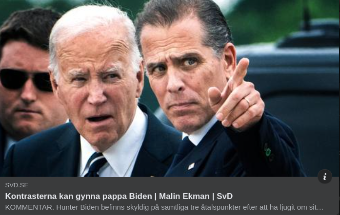 https://www.svd.se/a/yE7MrK/kontrasterna-mot-trump-rattegangen-kan-gynna-pappa-biden "Hunter Biden befinns skyldig på samtliga tre åtalspunkter efter att ha ljugit om sitt missbruk när han köpte en pistol. Det är första gången som ett barn till en sittande president döms för brott - men domen speglar bara en liten del av skandalen Biden enligt uppgifter är iblandad i. Hunter Biden ska ha tagit domen med jämnmod. När den lästes upp rapporteras han inte ha visat några känslor, bara nickat lugnt. Han befinns skyldig till att ha ljugit om sitt missbruk när han inhandlade ett skjutvapen i Delaware i oktober 2018. Det är första gången som ett barn till en sittande amerikansk president döms för brott i domstol. Sedan New York Posts avslöjande om Hunter Bidens laptop har bilder på presidentsonen i avslöjande situationer kablats över världen. På dem syns en naken, hög, i vissa fall tandlös, man. På en bild står han näck med nämnda skjutvapen i ungefärlig höjd med könsorganet och fingret på avtryckaren. Amerikansk federal lag förbjuder användare av olagliga droger att inneha skjutvapen. Först erbjöds presidentsonen en så kallad plea deal, amerikansk lingo för uppgörelse mellan åklagarsidan och den åtalade. Hunter Biden ombads gå med på att erkänna två skatteförseelser för att slippa åtal om vapenbrott. En domare fann dock uppgörelsen, som kritikerna kallade en ”sweetheart deal”, tveksam - och den föll. I stället blev det rättegång och på tisdagen förklarades Hunter Biden skyldig på samtliga åtalspunkter. Domen kommer samtidigt som hans far söker bli omvald och ligger efter i mätningarna. Ändå utgör den inte nödvändigtvis någon PR-katastrof. Att domen mot presidentens son tidsmässigt sammanfaller med den mot hans rival kan gynna Joe Biden. För vissa utomstående talar kontrasterna till Bidens fördel. Många amerikaner har själva varit fast i drogmissbruk eller har anhöriga som har det. Även bland jurymedlemmarna fanns personliga erfarenheter av närstående med missbruk. Det är sannolikt att Hunter Bidens beroende av crack-kokain väcker empati bland delar av den amerikanska allmänheten. Hans styvmamma tillika USA:s första dam Jill Bidens regelbundna besök i rättssalen kan också ge bilden av en sammanhållen familj – och kontrastera mot Melania Trumps uteblivna närvaro vid rättegången mot hennes make i New York. Liksom pappa Bidens försäkran att han inte avser benåda sin son kan ställas i kontrast mot Donald Trumps ord om att han planerar benåda de 6 januari-demonstranter som han anser oskyldigt dömda. Samtidigt bortser ovanstående från andra aspekter. Domen i Delaware ger bilden av att skandalen kring Hunter Biden kretsar kring en personlig tragedi och inte innefattar hans far. I själva verket rör misstankarna kring Hunter Bidens förehavanden större och allvarligare frågor. New York Posts avslöjande före presidentvalet 2020, vilket felaktigt avfärdades som rysk desinformation, handlade om hur Hunter Biden introducerade sin pappa, vid tidpunkten vicepresident, till en Ukrainsk affärsman. Frågorna handlar om huruvida pappa Biden med hjälp av sin son, vid tidpunkten missbrukare, använt sin politiska position åt att berika familjen. Rättegången i Delaware handlade endast om sonens köp av skjutvapen och felaktiga intygande medan han led av missbruk. Inte sonens - eller faderns - affärsförehavanden. Med rättegången mot Donald Trump var det annorlunda. Åklagaren Alvin Bragg argumenterade för att en delstatlig förseelse - en felaktig bokföring av hyschpengar – i själva verket var en del av en allvarlig brottskomplott för att stjäla presidentvalet. Juryn gick på hans linje. Att den mediala bilden skiljer sig åt skulle kunna gynna Joe Biden – samtidigt som hans utmanare Donald Trump hittills inte verkar ha mött någon opinionsmässig motvind varken av domen i New York eller mediebilden av densamma. Däremot är domen mot Biden inte per automatik goda nyheter för Donald Trump. Som illustration över vad Trump anser vara ett politiserat rättsväsende hade det varit bättre för Trump om Hunter Biden friats. Joe Biden står samtidigt inför stora utmaningar – och ligger för tillfället efter i samtliga sju vågmästardelstater. Inte heller för sonen tycks utmaningarna vara över. Det är ännu oklart när påföljden meddelas. En nervös väntan – amerikanska medier rapporterar att Hunter Biden riskerar upp till 25 år i fängelse. Ett annat möjligt alternativ är villkorlig dom. I september väntar dessutom ett rättsfall i Los Angeles. Hunter Biden misstänks för att ha undvikit att betala motsvarande 14 miljoner kronor i federal inkomstskatt mellan åren 2016 och 2019."Helt oplanerat...