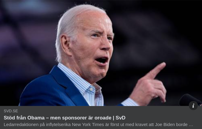 https://www.svd.se/a/1M5naW/new-york-times-biden-bor-stiga-at-sidan "Barack Obama tar ställning för Biden Men Joe Biden får även stöd. Förre presidenten Barack Obama twittrade på fredagen att alla kan göra en dålig debatt och att presidentens förmåga att debattera inte förändrar något för väljarna. ”Det här valet är fortfarande ett val mellan en person som hela sitt liv har slagits för vanliga människor och en annan person som bara bryr sig om sig själv”, skriver Barack Obama på X. Han beskriver Joe Biden som någon som kan skilja på rätt och fel medan Donald Trump ljuger för att gynna sin egen sak. En annan tung supporter som slutit upp bakom Biden är demokraten James Clyburn, som suttit i representanthuset sedan 1993 för South Carolina. – Vi som är mer intresserade av innehåll än stil, tycker fortfarande att när det kommer till innehåll är Joe Biden det bästa som har hänt det här landet under de senaste åren, säger James Clyburn, enligt Wall Street Journal. Men Clyburn indikerar också att stödet för presidenten inte är förbehållslöst. Det krävs att han gör bättre ifrån sig framöver. – Det här var första försöket, man får alltid tre försök, säger Clyburn. Debatten är just nu intensiv om vem som skulle kunna ta Bidens plats, om han väljer att träda tillbaka, men än så länge är stalltipset att Joe Biden hänger i ett tag till. Sponsorer oroas av Bidens hälsa Spekulationer om att vissa ledande demokrater skulle vara beredda att initiera en diskussion om ett eventuellt byte av presidentkandidat har hittills kommit på skam. Flera amerikanska medier vittnar dock om att potentiella ersättare till Biden har kontaktats av inflytelserika sponsorer som oroas av presidentens hälsotillstånd. Enligt Wall Street Journal har framträdande personer i Joe Bidens stab ägnat de senaste dagarna åt samtal med ledande personer i det demokratiska partiet samt ett antal viktiga sponsorer. Fokus ligger nu på Joe Bidens nästa offentliga framträdande som sker på lördagens kampanjmöte i East Hampton på Long Island, där flera tunga bidragsgivare till Bidens valrörelse kommer närvara. Enligt uppgifter i lokaltidningen East Hampstead Star, som tagit del av inbjudan, ska skådespelarna Michael J Fox, Sarah Jessica Parker och Matthew Broderick vara på plats. Även flera viktiga sponsorer inom finanssektorn, som till exempel hedgefondsförvaltaren Barry Rosenstein – som är värd för tillställningen – och finansparet Nicole Davison Fox och Michael Fox, kommer närvara. Biljetter till evenemanget ska enligt East Hampstead Star kosta mellan 3 300 och 250 000 dollar."