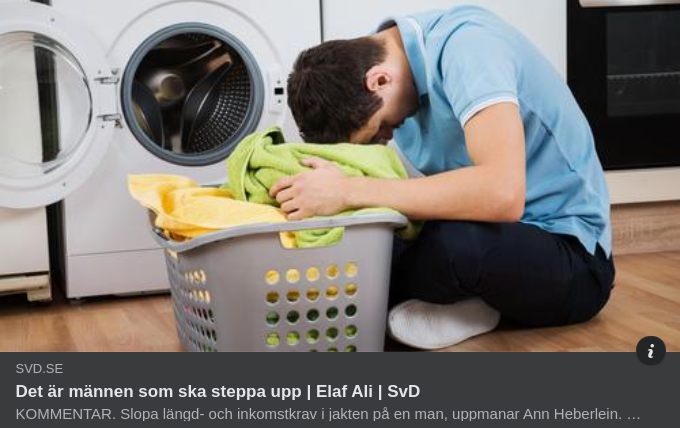 https://www.svd.se/a/0VQv8B/det-ar-mannen-som-ska-steppa-upp-ann-heberlein "I helgen skrev Ann Heberlein en uppmärksammad text om att heterokvinnor borde sänka sina krav när det gäller män de kan tänkas dejta, och att utvecklingen mot att kvinnor som skaffar barn på egen hand är skrämmande. För samhället – och för de män som blir utan en partner. Jakten på den rätte Hur höga krav ska man ställa på en framtida partner? Maila gärna dina tankar till kulturdebatt@svd.se Utvalda gensvar publiceras. Hon berättar om sina väninnor som kollar upp hur mycket mannen tjänar, var han bor och om han äger sin bostad innan de går på dejt. Som helst dejtar män som är äldre, längre och har högre status än dem själva. Kraven kan tyckas ytliga eller orimliga, men jag skulle säga att de är fullt rimliga. Historiskt har kvinnor främst haft rollen som mamma och fru och därför varit beroende av att män ska välja dem, men i dag har många kvinnor möjligheten att välja karriär och att vara självständiga. Jag upplever att Ann Heberleins text riktar sig just till den privilegierade singelkvinnan som redan har fått barn och har ett bra jobb och som kan göra val: ”Nöj er med en lite yngre, dummare och småfattig kille som kan vara en bra hemma-pappa medan du gör karriär.” Min egen sammanfattning. Samma strikta rollfördelning, om än med omvända kön. Varför det skulle vara bättre är oklart. Inte ens för att skaffa barn måste man stå ut med vara i en relation med en man. Dessutom vet jag flera kvinnor som gjort just detta, och när de kommit in i medelåldern har den ena efter den andra blivit dumpad av sin yngre pojkvän. Någonstans runt 35 känner sig killen färdig och har tömt kvinnan på det han kan få. Oftast har hon barn sedan innan, och något gemensamt barn kunde hon inte ge honom. Det här var inget problem för killen när han var i 20-års åldern, men efter 30-snåret verkar en biologisk klocka börja ticka även hos män. Jag tycker att kvinnorna ska fortsätta söka sig till äldre män, varför inte ta en som är minst tio år äldre så du alltid får känna dig fräsch. Dejtar man en äldre man har hans testosteronnivåer förhoppningsvis gått ner några procent med åldern. När Heberlein listar saker kvinnor söker på inför en dejt glömde hon nämna det kvinnor främst söker efter, nämligen domar i databaser över brottsregister – för att se om mannen man ska dela en bit mat med är dömd för våldsbrott. Det är jag säker på att män slipper oroa sig över. Mannen får gärna äga sin bostad och tjäna bra. När jag gått på dejt har jag ofta köpt nya kläder och har på mig fina underkläder, använt dyra krämer och parfymer och lagt tid på att sminka mig. Killen har i bästa fall tagit det som legat högst upp i smutstvätten och kammat håret. Att han ska tjäna mer än mig och vara längre än mina 163 centimeter är väl det minsta man kan begära? Män vill överlag känna sig behövda. Män vill känna sig starkare och större än sin kvinna. De vill tjäna mer och ha högre status. Det är så många känner sig manliga. Att dejta män med högre status är nog inte viktigt för alla kvinnor, men jag har märkt att män kan bli skrämda av en kvinna som vill mycket och har drömmar. Om man väljer en man som har högre status än en själv, så vet man att han kan fortsätta känna sig ohotad på toppen, och vi kvinnor kan fortsätta jaga våra drömmar utan att behöva stanna upp för att han känner att vi håller på att springa om honom. Men världen håller på att förändras. I dag är kvinnor inte längre beroende av män. Inte ens för att skaffa barn måste man stå ut med vara i en relation med en man. Och där har inte alla män hängt med: de har inte förstått att de måste höja sig några nivåer, och exempelvis bli mer kommunikativa, varma och komma ihåg födelsedagar om vi kvinnor ska välja att hellre leva med dem, än utan dem. Elaf Ali"