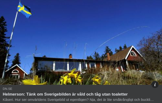 https://www.dn.se/kultur/helmerson-tank-om-sverigebilden-ar-vald-och-tag-utan-toaletter/ "Erik Helmerson Text Scenen är ett packat rum i Visby hamn. Som värd för Almedalsseminariet står Svenska institutet. Rubriken: ”Sverigebilden – myter, verklighet och vägen framåt”. Bakgrund: Ett år av koranbränningar, LVU-protester och gängvåld. Fråga: Hur ser omvärldens Sverigebild ut egentligen? Svar: Nja, det är lite småkrångligt och buckligt just nu kanske, om ni envisas. Men annars: Toppen! Fridens liljor! Jajamen, foten i kläm! Sassa brassa mandelmassa! Panelen kom från institutioner som Svenska institutet, Volvo och Ikea, och två saker var den överens om: Vi måste hitta en gemensam berättelse, och den berättelsen, det ”narrativet”, är att Sverige ändå är i finfint skick. Bland annat, nämndes det, imponeras utlänningar som hittar hit storligen av friheten för våra barn, infrastrukturen och skolorna. Här började man ju omedelbart fundera. Vi är 10,5 miljoner svenskar. Det kan bli svårt att enas i en berättelse om just dessa ämnen, särskilt om man frågar någon som inte vågar släppa ut barnen på gården under pågående knarkförsäljning, som suttit fast på ett toalettlöst tåg i sju timmar på grund av signalfel eller som haft barn i en skola som först mest erbjöd håltimmar, därefter gick i konkurs. Åh, panelen, ge mig lite av er varumärkesoptimism, tänkte jag när de för trettonde gången formligen strålade ut ord som ”innovation” och ”cirkulär omställning” i förväntan att vi 10,5 miljoner till slut skulle hitta det där narrativet som får världen att, om de ens kan placera Sverige i rätt världsdel, höja oss till skyarna som kronan bland fria länder. Till slut räckte en kvinna i publiken upp handen: ”Vi är några från Viking Line som är i Almedalen”, sa hon på finlandssvenska. ”Alltså, varje gång det är en gängskjutning i Sverige får vi avbokningar av våra resenärer. Vi har kunder som inte vågar resa dit längre. Människor flyttar till Åland för att de är otrygga. Skulle det kanske gå att hitta något exempel där den svenska polisen ger en sorts framgångsberättelse i kampen mot kriminaliteten..?” Men då var seminarietiden slut."