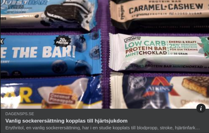 https://www.dagensps.se/life-science/vanlig-sockerersattning-kopplas-till-hjartsjukdom/ "Erythritol används för att öka volym eller söta stevia, munkfrukt och sockerreducerade keto-produkter. Nu kopplar en studie denna sockerersättning till okad risk för hjärt- kärlsjukdom, det rapporterar CNN. “Riskgraden var inte blygsam”, säger studiens huvudförfattare Stanley Hazen, chef för Center for Cardiovascular Diagnostics and Prevention vid Cleveland Clinic Lerner Research Institute, till CNN. Populär sockerersättning Erytritol är en sockeralkohol, en kolhydrat som finns naturligt i många frukter och grönsaker, precis som sorbitol och xylitol. Den har cirka 70 procent av sockers sötma och anses av experter vara helt kalorifri. Den har ingen kvardröjande eftersmak, höjer inte blodsockret, har mindre laxerande effekt än vissa andra sockeralkoholer och tillverkas artificiellt i stora mängder Erytritol ser ut som socker och smakar som socker och har blivit populärt inom livsmedelsindustrin. Enligt Stanley Hazen är erytritol en extremt populär tillsats till keto och andra låg-kolhydratprodukter och livsmedel som marknadsförs för personer med diabetes. Erytritol är enligt honom också den största ingrediensen, räknat i vikt, i många “naturliga” stevia- och munkfruktprodukter. Stevia och munkfrukt är cirka 200 till 400 gånger sötare än socker, varför bara en liten mängd behövs, huvuddelen av produkten är erytritol, som ger det sockerliknande utseende som konsumenter förväntar sig."