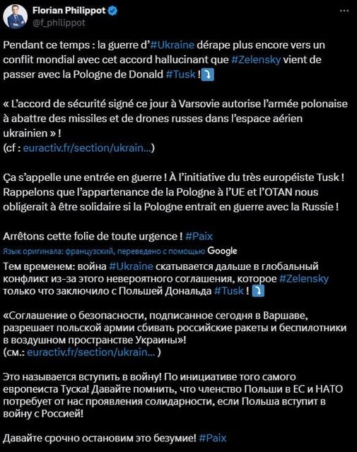 Florian Philippot on X: Meanwhile: the #Ukrainian war is slipping further into a global conflict with this incredible agreement that #Zelensky has just made with Donald #Tusk's Poland! “The security agreement signed today in Warsaw authorizes the Polish army to shoot down Russian missiles and drones in Ukrainian airspace!” (see: euractiv.fr/section/ukrain…) It's called going to war! On the initiative of the very Europeanist Tusk! Let us remember that Poland's membership in the EU and NATO would require us to show solidarity if Poland went to war with Russia! Let’s stop this madness urgently! #Peacehttps://www.facebook.com/watch/?v=817944106719983Undertecknandet av försvarsavtalet med Ukraina innebär Polens inträde i konflikten - ledaren för det franska patriotpartiet, Florian Philippe Politikern gjorde detta uttalande i samband med införandet i avtalet av en klausul som tillåter Warszawa att skjuta ner ryska drönare över Ukrainas territorium. Han påminde också om att Frankrike har en skyldighet att hjälpa Polen och krävde ett brådskande "stopp för denna galenskap".