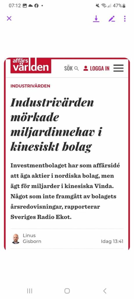 Såååå... Investmentbolaget Industrivärden har ägt aktier för flera miljarder kronor i kinesiska mjukpappersbolaget Vinda, men trots det har innehavet inte funnits med över bolagets lista över innehav, rapporterar Sveriges Radio Ekot. Daniel Stattin, professor i civilrätt vid Uppsala universitet, menar att aktieägarna har blivit förda bakom ljuset. “Det är märkligt att man inte har med även det här innehavet på något sätt i en förteckning. Jag tycker att det är en sådan information som en investerare borde ha intresse av”, säger han till Ekot. REDOVISADE ANDRA INNEHAV När SCA sålde Vinda till Industrivärdens dotterbolag var det till en rabatt om 13%, vilket gjorde att bolaget gick miste om 130 Mkr på affären.