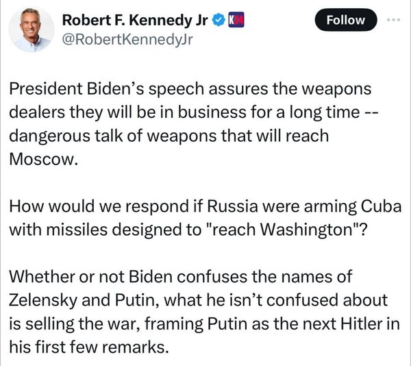 Robert F. Kennedy Jr på X: President Bidens tal försäkrar vapenhandlarna att de kommer att vara i affärer länge -- farligt tal om vapen som kommer att nå Moskva. Hur skulle vi reagera om Ryssland beväpnade Kuba med missiler designade för att "nå Washington"? Oavsett om Biden blandar ihop Zelensky och Putins namn eller inte, vad han inte är förvirrad över är att sälja kriget, att sätta in Putin som nästa Hitler i sina första kommentarer.