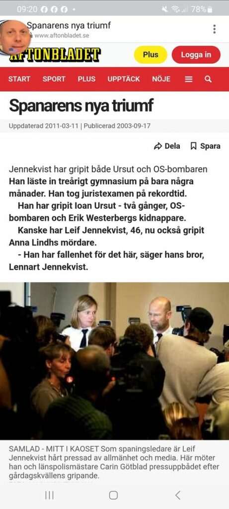 Han kom in som elfte reserv på polisskolan - men sedan dess har karriären gått spikrakt uppåt. När fyrabarnspappan Leif Jennekvist, chef för länskriminalen i Stockholm, sent i onsdags eftermiddag inledde jakten på gärningsmannen, levde ännu Anna Lindh. Men några timmar senare, tidigt torsdag morgon, var det en mördare han jagade. Lugn och ödmjuk Varje dag - utom i går på dagen när jakten var inne i sitt mest intensiva skede - har han synts i tv-rutan, där han på polisens dagliga presskonferens lugnt och samlat, klart men kortfattat, har svarat på frågor från media. En man med låg profil och ödmjuk framtoning som inte söker rampljuset. Till skillnad från Hans Holmér, på sin tid, hade han två dagars skäggstubb redan från start - och till skillnad från Hans Holmér har han gått den långa vägen som polis. - Han är ingen papperspolis direkt. Han har ju burit omkring på fyllon som alla andra och suttit utanför hus i timmar, dygn och veckor. Han vet vad det handlar om, säger hans storebror Lennart Jennekvist. Brodern är brandman Liksom sina bröder är han själv inte ovan vid brott och katastrofer - han är kriminalreporter på Västerviks-Tidningen. En yngre bror är brandman i Stockholm och var en av de första på plats efter vansinneskörningen på Västerlånggatan i maj. Hans syster har tidigare jobbat på justitiedepartementet. Leif Jennekvist är född 1957 - och årsbarn med Anna Lindh. Han är uppväxt i Västervik, där mamma och pappa fortfarande bor kvar - och varje dag spänt följer presskonferenserna och nyhetssändningarna på tv. - Ja, dem missar vi inte. Vi tänker på honom hela tiden. Lite telefonkontakt har vi, men det blir mest sms, säger hans mamma, Sonja Jennekvist. - Lite nervöst har det varit, men han är rustad för det här. Hoppade av skolan Efter nio år i skolan hoppade han av. Han var trött på plugget och började jobba på en resebyrå hemma i Västervik i stället. Efter lumpen i Vaxholm bestämde han sig för att bli polis. Men för att komma in på polisskolan var han tvungen att ha gymnasiekompetens - den läste han in på bara några månader. Som nybliven polis kom han ganska snart till rikskriminalen. Samtidigt började han läsa juridik och tog sin juristexamen på rekordtid. Lika snabbt som Olof Palme och Herbert Tingsten, enligt Västerviks-Tidningen som stolt rapporterade om hemmasonens bedrifter. Sin tingsmeritering gjorde han i Västervik, liksom en del av sin polischefsutbildning. Jobb åt regeringen Under tre år var Leif Jennekvist utlånad till regeringen, som sakkunnig i polisfrågor på civil- och justitiedepartementet - samtidigt som hans syster jobbade där. Eftersom han var polis och polischefsutbildad ingick han dock samtidigt i polischefsjouren. Under den tiden ledde han gripandet av den rumänske brottslingen Ioan Ursut som hösten 1989 skottskadade en polis under en av sina rymningar. Chef efter 17 år Efter 17 år inom polisyrket utsågs Leif Jennekvist 1994 till chef för länskriminalen i Stockholm. Efter bara några veckor sköts fyra personer ihjäl utanför Sturecompagniet i Stockholm - och Leif Jennekvist ledde jakten på gärningsmännen, som greps tre dygn senare. Andra uppmärksammade fall han har lett - och lyckats lösa - är OS-bombaren på Millesgården i Stockholm 1997, konstkuppen mot Nationalmuseum i december 2000 och kidnappningen av Erik Westerberg förra året. Nu, mindre än en vecka efter mordet, kan han redan ha gripit Anna Lindhs mördare - något han själv har varit övertygad om redan från början. "Vi klarar upp det" - Vi kommer att klara upp det här, sa han i en intervju med Aftonbladet i fredags. Kanske är han på god väg att göra det. Men äran vill han inte ta åt sig själv - den tänker han i så fall dela med alla dem som har arbetat med fallet. Som chef för länskriminalen och pappa till fyra barn i ett tidigare äktenskap finns det inte så mycket tid över för annat. Men Västervik har han inte övergivit - även om dialekten har slipats av med åren, i alla fall i officiella sammanhang. På semestrar och helger åker han gärna till sommarhuset där. I går - mitt under mördarjakten - ringde han storebror Lennart. - Han var orolig för den öppna båten och bad mig täcka över den, säger Lennart Jennekvist."