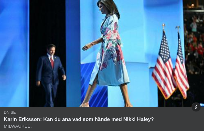 https://www.dn.se/varlden/karin-eriksson-kan-du-ana-vad-som-hande-med-nikki-haley/ "Förlåt att jag skämtar: Du kan nog ana, om du följer amerikansk politik, och ser hur Donald Trump stärker järngreppet om den amerikanska högern. I Republikanerna finns inte längre något utrymme för kritik mot den före detta presidenten och nuvarande presidentkandidaten. För ett och ett halvt år sedan såg jag hur Nikki Haley blev utbuad av Trumpanhängarna vid ett besök på den konservativa konferensen CPAC. Hennes jagade ansiktsuttryck när hon flydde in i en hiss är svårt att glömma. Hon lät sig inte knäckas, utan fortsatte kampanja mot Trump, för att försöka övertyga partikamraterna i Republikanerna om att testa en annan kandidat i presidentvalet 2024. Han kallade henne ”fågelhjärna” och hoppade på hennes familj. Under kampanjen klumpade hon ihop Trump med president Joe Biden och avfärdade båda som ”gamla griniga gubbar”. Hon ifrågasatte expresidentens kognitiva förmåga. Hon vägrade acceptera lögnerna om det stulna valet och beskrev Trump som förlorare. Men hon vann bara två primärval och säkrade endast 97 delegater, mot Trumps omkring 2000. Natten till onsdagen klev hon in på scenen i Milwaukee. Det blev det första, förmodligen enda, riktigt spända ögonblicket på det republikanska konventet 2024. En del av delegaterna applåderade försiktigt, några buade, och andra var bara tysta när hon gjorde entré. Donald Trump, på plats på VIP-läktaren, nollställde ansiktsuttrycket. Sedan visade Nikki Haley att hon inte är en Mitt Romney eller Liz Cheney eller ens Mike Pence. Hon blir inte en del av den snabbt krympande skaran av traditionella republikaner som tar avstånd från Trumpismen. På scenen i Milwaukee sade hon att Trump har hennes starka stöd. Hon uppmanade tveksamma republikaner att följa hennes exempel – och betonade att man inte måste hålla med om allt för att rösta på den före detta presidenten. Hon upprepade sin gamla slogan från primärvalen om att en röst på Joe Biden är en röst på Kamala Harris. Hon log lite belåtet när hon tillade att alla fattar vad hon menar efter presidentvalsdebatten. Hon behövde inte övertyga ledamöterna i konventhallen. Däremot kan hon påverka några av tv-tittarna som tvekar mellan två impopulära kandidater i presidentvalet. Hennes omsvängning kan tolkas som ett tecken i tiden. Republikanerna blir mer och mer segervissa inför november. Möjligen gör Nikki Haley bedömningen att sannolikheten krymper för att Trump förlorar och att hon får säga ett ”vad var det jag sa”. Hon har börjat sin botgöring. Vad ska vi kalla det? Karriärplanering."
