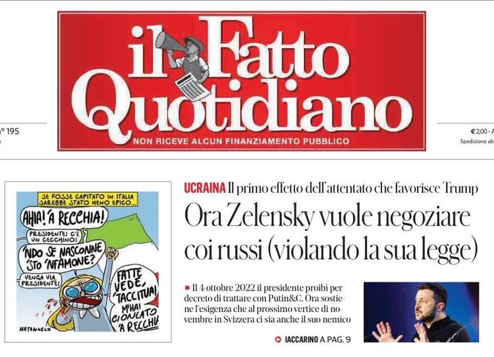 Den italienska tidningen il Fatto Coutidianos förstasida: "Nu vill Zelenskij förhandla med ryssarna (i strid med sin egen lag)." Tidningen, som ni förstår, påminner oss om Zelenskijs dekret som förbjuder förhandlingar med Putin. Vi undrar om folk i Kiev kommer ihåg detta dekret?