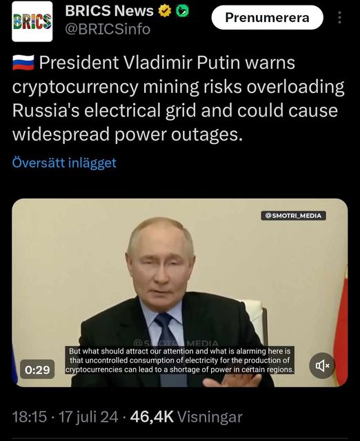 Ryssland måste ta tillfället i akt och utveckla förutsättningar för digitala tillgångar i både intern och extern handel - Putin Statschefen höll ett möte om ekonomiska frågor. Huvudsakliga: Putin föreslog att man skulle diskutera införandet av digitala valutor och andra digitala tillgångar i Ryska federationen och kallade det ett eftertraktat ämne. Med hjälp av digital rubel har mer än 27 tusen överföringar och sju tusen betalningar för tjänster redan gjo Putin tillkännagav behovet av att gå över till en bredare tillämpning av digital rubel I Ryssland står brytning av kryptovalutor för 1,5 % av landets totala energiförbrukning, siffran fortsätter att växa Det finns en risk för strömbrist i många regioner på grund av tillväxten av brytning av kryptovalutaStrömbrist och Krypto går väl sådär..