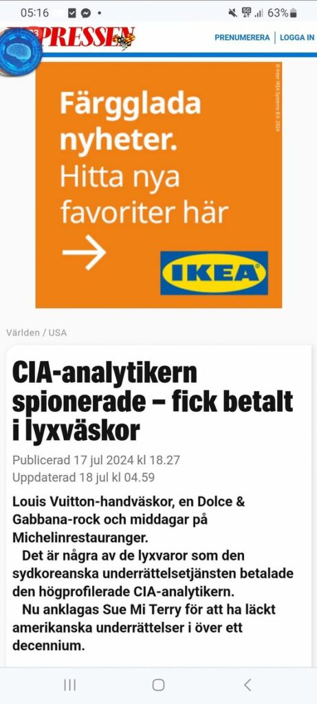 I utbyte mot lyxväskor Enligt amerikanska medier ska samarbetet med den sydkoreanska regeringen ha startat 2013 då hon enligt åtalet ”vid flera tillfällen” började träffa en icke namngiven ”tjänsteman”. I åtalet skriver åklagaren att Terry ”på uppdrag av tjänstemän från Sydkoreas regering har förespråkat sydkoreanska politiska ståndpunkter, bland annat i publicerade artiklar och under framträdanden i media”. Hon misstänks också för att ha ”avslöjat icke-offentlig information från USA:s regering för Sydkoreas underrättelseorganisation”. Alltsammans ska ha skett i utbyte mot lyxvaror. Det rör sig om en Louis Vuitton-handväska för motsvarande 36 000 kronor, en Bottega Veneta-väska värd cirka 31 000 kronor, en Dolce & Gabbana-kappa för 30 000 kronor, och ett antal besök på Michelinrestauranger. Hon ska också ha fått ersättning på motsvarande nästan 400 000 Louis Vuitton-handväskor, en Dolce & Gabbana-rock och middagar på Michelinrestauranger. Det är några av de lyxvaror som den sydkoreanska underrättelsetjänsten betalade den högprofilerade CIA-analytikern. Nu anklagas Sue Mi Terry för att ha läckt amerikanska Sue Mi Terry är en högprofilerad CIA-analytiker och flitigt anlitad kommentator i amerikanska medier kring frågor gällande Östasien. Hon har varit en del av USA:s nationella säkerhetsråd – både under George W Bush och Barack Obama, och är i dag knuten till tankesmedjan Council on Foreign Relations i New York. Nu verkar dock tiden som amerikansk toppkommentator vara över. På tisdagen åtalades Terry för att i över ett decennium ha agerat utländsk agent för Sydkorea. I utbyte mot lyxväskor Enligt amerikanska medier ska samarbetet med den sydkoreanska regeringen ha startat 2013 då hon enligt åtalet ”vid flera tillfällen” började träffa en icke namngiven ”tjänsteman”. I åtalet skriver åklagaren att Terry ”på uppdrag av tjänstemän från Sydkoreas regering har förespråkat sydkoreanska politiska ståndpunkter, bland annat i publicerade artiklar och under framträdanden i media”. Hon misstänks också för att ha ”avslöjat icke-offentlig information från USA:s regering för Sydkoreas underrättelseorganisation”. Alltsammans ska ha skett i utbyte mot lyxvaror. Det rör sig om en Louis Vuitton-handväska för motsvarande 36 000 kronor, en Bottega Veneta-väska värd cirka 31 000 kronor, en Dolce & Gabbana-kappa för 30 000 kronor, och ett antal besök på Michelinrestauranger. Hon ska också ha fått ersättning på motsvarande nästan 400 000 kronor. I åtalet nämns ett antal situationer då Terry läckt information. Bland annat ett topphemligt möte med USA:s utrikesminister Antony Blinken i juni 2022. Så snart mötet avslutades skickade Terry sin kontaktperson ”detaljerade anteckningar” om mötets innehåll. Sjöng för Biden Sydkorea är en nära allierad till USA. Senast i april 2023 träffades USA:s president Joe Biden och Sydkoreas president Yoon Suk Yeol på toppmöte i Vita huset – då Yoon Suk Yeol bland annat sjöng för Biden. Läckorna sätter nu de goda relationerna på prov. Ändå är det inte första gången de goda vännerna spionerar på varandra. Interna Pentagon-dokument som läckte ut förra året visar USA:s omfattande avlyssning av sina allierade, däribland Sydkorea. Terry nekar till brott. Hennes advokat Lee Wolosky säger till Wall Street Journal att anklagelserna är ogrundade och att de ”förvränger arbetet för en forskare och nyhetsanalytiker som är känd för sitt oberoende och sina många år i USA:s tjänst”.