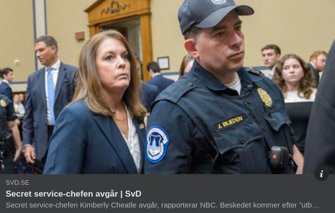 https://www.svd.se/a/dRRWWw/secret-service-chefen-kimberly-cheatle-avgar "Secret service-chefen Kimberly Cheatle avgår, rapporterar NBC. Beskedet kommer efter ”utbredd upprördhet” över myndighetens misslyckande med att förhindra mordförsöket på Donald Trump. Efter hård kritik lämnar Kimberly Cheatle sin post som chef för Secret service, vilket NBC var först att rapportera genom källor. Senare bekräftade Cheatle själv sin avgång i ett mejl till polisorganisationens anställda. ”Jag tar fullt ansvar för säkerhetsmissen. I ljuset av vad som skett är det med tungt hjärta jag fattat det svåra beslutet att avgå som er chef”, skriver hon i mejlet. Beskedet kommer tio dagar efter mordförsöket på Donald Trump. Kritiken mot Cheatle och Secret service som myndighet har haglat efter misslyckandet att förhindra mordförsöket på den tidigare presidenten. En 20-årig skytt tog sig upp på ett tak under ett kampanjmöte i Butler, Pennsylvania, och avfyrade skott mot Trump som träffade honom i örat. Cheatle har tidigare beskrivit mordförsöket som Secret service ”största misslyckande på decennier” och att hon tar på sig det fulla ansvaret för missen, men att hon inte haft för avsikt att avgå. Kunde inte svara på frågor Hon grillades av representanthusets översynsutskott under måndagen. Då kunde Cheatle inte svara på flera av kongressledamöternas frågor, bland annat om varför hustaket där skytten gömde sig inte var satt under bevakning. Samtidigt fortsatte hon hävda att hon var ”rätt person” att leda Secret service. Men på tisdagen kom alltså beskedet att hon avgår. ”I dag har du inte kunnat svara på grundläggande frågor angående det häpnadsväckande misstaget och försäkra det amerikanska folket att Secret service lärt sig en läxa”, skrev utredningsutskottets ordförande republikanen James Comer och demokraten Jamie Raskin i ett brev till Cheatle efter mötet, rapporterar NBC News. Båda krävde Cheatles avgång som ett första steg i arbetet att återskapa ”kongressens och det amerikanska folkets förtroende” för organisationen. Flera andra tunga kongressledamöter från både Demokraterna och Republikanerna har krävt hennes avgång, bland dem talmannen Mike Johnson och republikanernas gruppledare Steve Scalise. En arbetsgrupp över partigränserna kommer att tillsättas i representanthuset för att utreda mordförsöket på Trump."
