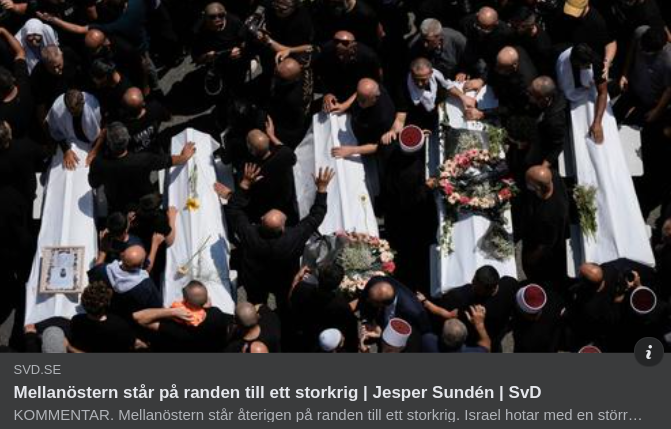 https://www.svd.se/a/QMJxE4/mellanostern-star-pa-randen-till-ett-storkrig-efter-attackerna "Konfliktnivån i Mellanöstern har höjts ytterligare efter en raketattack som dödade tolv barn på en fotbollsplan i den drusiska byn Majdal Shams, som ligger i den israeliskt kontrollerade delen av Golanhöjderna. Enligt den israeliska försvarsmakten var raketen iransk och av en typ som enbart den libanesiska Hizbollah-milisen har i området. Milisen förnekar ansvar, men innan det kom rapporter om döda barn tog den på sig ansvaret för en attack mot en israelisk militäranläggning som ligger bara tre kilometer från fotbollsplanen, enligt BBC. Detta fick den israeliska premiärministern Benjamin Netanyahu att skynda sig hem från USA och utlova att Hizbollah ska få betala ett högre pris för attacken än någonsin tidigare. Tidigt på söndagen genomförde Israel också ett flertal attacker mot mål långt in i Libanon. Men betydligt fler är att vänta. Detta riskerar i sin tur att leda till ännu hårdare svar från Hizbollah. Angreppen utgör det senaste ledet i en flera månader lång upptrappning sedan den 8 oktober. Då började Hizbollah skjuta raketer mot norra Israel, i det uttalade syftet att stödja palestinska Hamas, efter dess terrorattack mot södra Israel. Både Hizbollah och Hamas är nämligen allierade med Iran, som förser grupperna med vapen, pengar och tekniskt kunnande. Alla strävar de efter att utplåna staten Israel, men medan Hamas försökt få med de andra i ett fullskaligt krig har Iran och Hizbollah sagt sig vilja undvika just det. SvD har tidigare liknat situationen mellan Israel och Hizbollah vid tonårskillar på en skolgård som står och knuffar på varandra. Ett sorts småbråk som lätt kan leda till fullt slagsmål om en av dem råkar slå lite för hårt mot den andre. För den senaste tiden har Hizbollah skjutit allt fler raketer mot Israel och orsakat allt större skada. Israel har å sin sida svarat med att döda flera högt uppsatta Hizbollahledare, för att försöka få milisen att upphöra med beskjutningen. Den har emellertid sagt att det inte kommer att ske förrän det blir ett eldupphör i Gaza. Internationella bedömare och aktörer har under lång tid varnat för att attackerna mellan Israel och Hizbollah skulle kunna utlösa ett större krig i regionen, med ännu fler aktörer involverade. Lördagens raketangrepp mot fotbollsplanen är ett typiskt exempel på hur det skulle kunna gå till. Tidigt på lördagen sköt Hizbollah en drönare mot ett israeliskt gasfält. Drönaren sköts ned men som vedergällning skickade Israel en robot mot södra Libanon som dödade medlemmar av Hizbollahs elitstyrka Radwan. Milisen svarade då med en raketattack mot norra Israel och Golanhöjderna. Det riktar återigen fokus mot norra Israel och de minst 60 000 israeler som tvingats fly sina hem i gränstrakterna mot södra Libanon – varifrån ungefär lika många libaneser tvingats bort. Den högerextreme israeliske ministern Itamar Ben-Gvir påminde försvarsminister Yoav Gallant om att ”den röda linjen passerades för länge sedan”, vilket kan tolkas som en uppmaning till hårdare tag mot Hizbollah. Gallant försäkrade å sin sida att milisen kommer att få betala för den dödliga attacken. Israels utrikesminister Israel Katz sa i en tv-intervju på lördagen att landet nu står inför ett fullskaligt krig, samtidigt som det iranska utrikesdepartementet varnar för konsekvenserna av nya israeliska ”äventyr” i Libanon. Världen tvingas återigen hålla andan inför risken för att ett storkrig ska bryta ut i regionen."