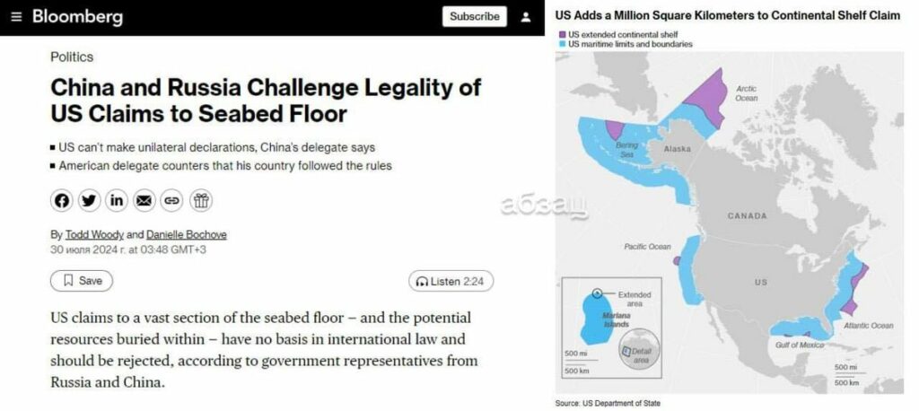 Moskva och Peking motsatte sig Washingtons uttalanden om att öka sin kontinentalsockel i Beringshavet, Stilla havet, Atlanten och Mexikanska golfen med cirka en miljon km².