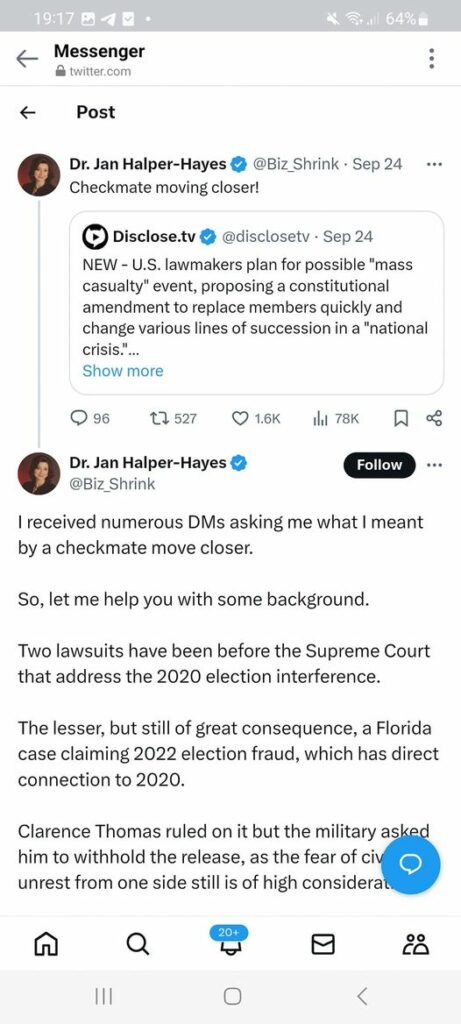 I received numerous DMs asking me what I meant by a checkmate move closer. So, let me help you with some background. Two lawsuits have been before the Supreme Court that address the 2020 election interference. The lesser, but still of great consequence, a Florida case claiming 2022 election fraud, which has direct connection to 2020. Clarence Thomas ruled on it but the military asked him to withhold the release, as the fear of civil unrest from one side still is of high consideration. The significant case before the Supreme Court is referred to as the Brunson Case. In short, it accuses nearly 400 elected officials of dereliction of duty. If SCOTUS rules favorably, those listed in the lawsuit can never return to an elected position. A rapidly spreading rumour is that Loy Brunson signed an NDA with the Supreme Court. I was with Loy Brunson early June and he hasn’t heard anything. Then July 27-28th I was with Loy again. At that time he told us that it was still in line for consideration before the court. Fact checker sites post failure of the case. NOT TRUE! View the links: https://loybrunson.com