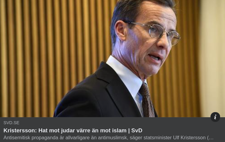 https://www.svd.se/a/B0b0w0/kristersson-hat-mot-judar-varre-an-mot-islam "– Jag tycker illa om alla former av förolämpningar. Men antisemitismen tycker jag har en särställning, av många olika skäl. Antisemitismen har en alldeles unik historia och den hittar ständigt nya sätt att sprida gamla konspirationsteorier, säger han till Dagens Nyheter. I en intervju med tidningen ställs Kristersson till svars om återkommande skandaler där sverigedemokratiska politiker bland annat anklagats för att ha spridit grov kritik mot islam. Senast justitieutskottets ordförande Richard Jomshof som utretts för hets mot folkgrupp för två bilder som delats på X, men där utredningen lagts ned. Statsministern ansvarar för regeringen och Tidösamarbetet – men varje parti måste ta ansvar för vad de själva gör och säger, enligt Kristersson. På frågan om det är värre att sprida nidbilder av judar än att sprida motsvarande bilder om islam svarar han: – Ja, att sprida antisemitism som går ut på judar som folkslag, det är riktigt illa."