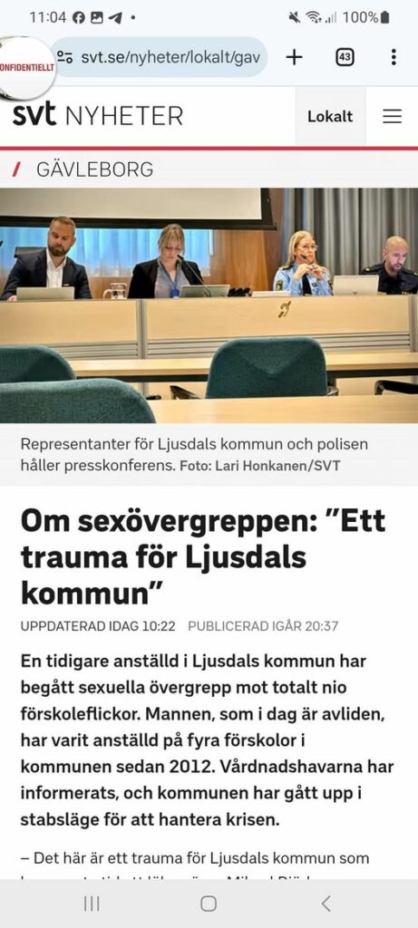 https://www.svt.se/nyheter/lokalt/gavleborg/ljusdals-kommun-i-stabslage-efter-sexuella-overgrepp-inom-forskolan "Det här är ett trauma för Ljusdals kommun som kommer ta tid att läka, säger Mikael Björk, kommundirektör på Ljusdals kommun under presskonferensen på onsdagsmorgonen. Nio flickor Ljusdals kommun har satt sig i stabsläge efter att det framkommit att en tidigare anställd inom kommunens förskolor utfört sexuella övergrepp på nio flickor. – Det ska inte finnas några oidentifierade barn som har drabbats, säger Emma Vangstad, gruppchef inom polisen för internetrelaterade sexuella övergrepp mot barn. Kommunen kommer att undersöka vidare om personen har arbetat på fler förskolor i kommunen eller i närliggande kommuner. Gärningsmannen avliden Vårdnadshavarna till drabbade barn har kontaktats av polisen under gårdagen, och kommunen har inrättat en stödgrupp för att ge hjälp till de drabbade. Gärningspersonen är avliden, meddelar kommunen via ett pressmeddelande och inget åtal kommer att väckas. – Vad vi kan se har vi följt våra rutiner när den här personen anställdes. Men uppenbart har inte det räckt till. Vi kommer därför att se över och ändra våra rutiner. Vi kommer också att ta in en extern utredare för att granska våra rutiner, säger Linnea van Wagenen kommunledningschef. Kommunen har lovat regelbundna uppdateringar via sin hemsida och dagliga pressträffar för att hålla allmänheten informerad."