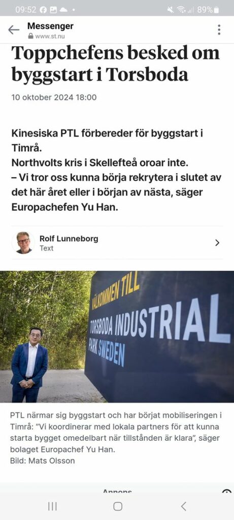 "Byggstarten närmar sig. Målet för produktionsstart är satt till 2026, om tillstånden blir klara berättar Yu Han. Öppna bild i helskärmsläge Byggstarten närmar sig. Målet för produktionsstart är satt till 2026, om tillstånden blir klara berättar Yu Han. Bild: Mats Olsson Det är i den kontexten som PTL nu säkerhetsgranskas av svenska myndigheter. Lagen är ny och häromdagen var Pernilla Berg vid Sundsvalls kommun kritisk till hur granskningen genomförs. – ISP ska göra en säkerhetsgranskning av etableringen men det är uppenbart att de inte riktigt vet hur de ska gå till väga. De ställer för många frågor. De famlar, sade hon till ST. Även Yu Han har synpunkter: – Kommunikationen och transparensen skulle kunna förbättras. Vi får många frågor som ska besvaras men det är en ny process för myndigheten och den är ny för oss. Vilka frågor är svårast? – Det rör granskning i andra länder och frågor som rör produkt, teknologi och kunder, men det är en hemlig ”Black box-process” som jag inte kan gå närmare in på. Är du orolig för beskedet från ISP? – Nej."