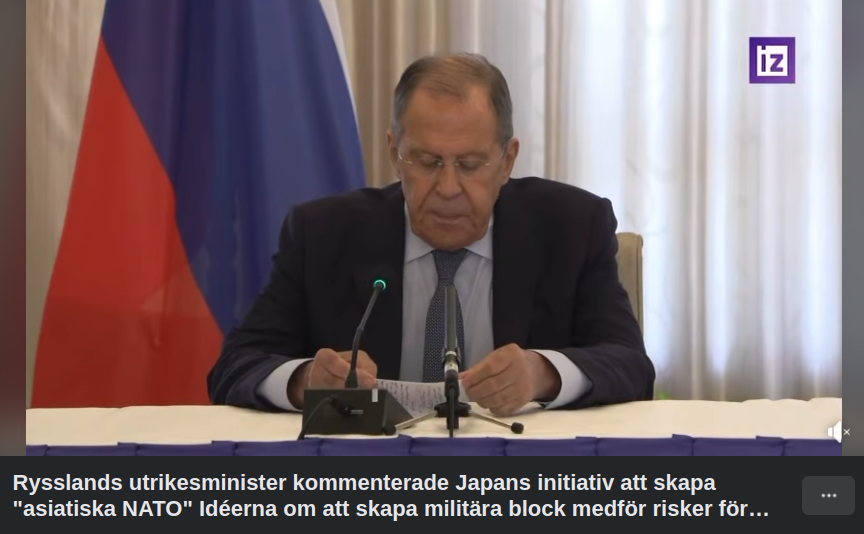 Rysslands utrikesminister kommenterade Japans initiativ att skapa "asiatiska NATO" Idéerna om att skapa militära block medför risker för en konfrontation som kan gå in i en hetsig fas. Ryssland är bekymrat över återmilitariseringen av Japan, förkastandet av fredlig utveckling kan leda till att det befintliga systemet för världsordning avvecklas.