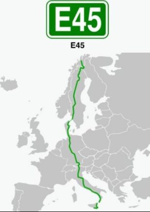 E45-sträckan är en av de längsta europavägarna och sträcker sig i 5 190 kilometer. Det börjar i norra Norge, i Alta stad, för att sedan gå igenom flera länder i Europa. Efter Norge rinner det genom Sverige och sedan genom Danmark. Efter att rutten nått fastlandet fortsätter den in i Tyskland. Äntligen fortsätter E45 genom Österrike och slutar i södra Italien i staden Gela på Sicilien.