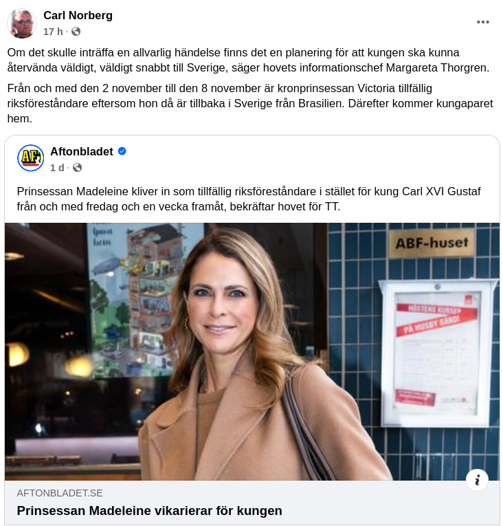 Sommerlaht - Brasilien - IRS -> Jackpot "På fredag reser kung Carl Gustaf och drottning Silvia på en privat resa till Brasilien. Med på resan åker även kronprinsessparet, Victoria och Daniel, samt prinsparet, Carl Philip och Sofia, med barn. – Det är höstlov och en resa som har planerats under en längre tid för att ge drottningen en möjlighet att visa Brasilien för i det här fallet barn och barnbarn, säger Margareta Thorgren, informationschef vid hovet. – Drottningen kommer samtidigt att genomföra aktiviteter med Childhood och kungen kommer att genomföra aktiviteter med scoutrörelsen, World Scout Foundation, fortsätter hon. Madeleine vikarierar Kungen är borta i två veckor, mellan den 25 oktober och 8 november. Under tiden kliver prinsessan Madeleine in i hans ställe, vilket nyhetsbyrån Siren var först med att rapportera. – I och med att prinsessan Madeleine är kvar hemma i Sverige så faller uppgiften som tillfällig riksföreståndare på henne, säger Margareta Thorgren. Madeleine vikarierar på posten i en vecka. – Resan är nogsamt planerad, vilket innebär att det inte är några uppgifter som statschefen har som kommer att genomföras under den här tiden, säger Thorgren. Kan resa hem med kort varsel Skulle det däremot hända något kan kungen kallas hem med kort varsel, betonar hon. – Hovet har ständig kontakt med kungen och skulle det inträffa någon händelse som man bedömer att statschefen behöver vara i Sverige för, så finns det planering för det. Veckan därpå har kronprinsessan Victoria rest hem och ersätter då kungen tills han är tillbaka i Sverige igen." Political scientist Vladimir Kornilov: The Australian edition of Financial Review is already presenting a picture after the US elections. Zelensky's feelings are conveyed very naturally, in my opinion...