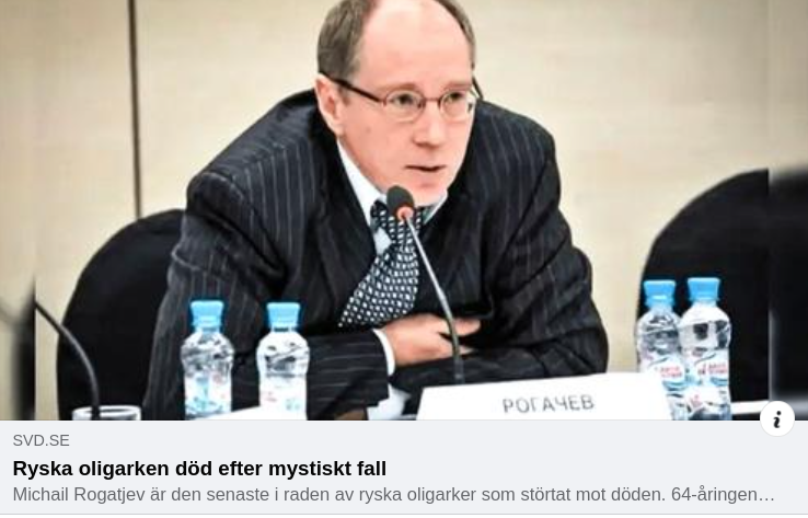 https://www.svd.se/a/B0k53l/annu-en-rysk-oligark-dod-efter-mystiskt-fall "Michail Rogatjev är den senaste i raden av ryska oligarker som störtat mot döden. 64-åringen föll från tionde våningen i ett bostadshus i Moskva. ”Det går inte att utesluta mord”, säger Jonas Kjellén, Rysslandsexpert på FOI. Ryska, statskontrollerade medier har beskrivit händelsen som ett självmord då Rogatjev led av en påstådd, svår cancerform och därför var deprimerad. Något som den dödes familj och innersta krets bestämt förnekat. Rogatjev var tidigare vice vd för oljejätten Yukos som bröts upp efter att ägaren Michail Khodorkovsky fängslats i efterdyningarna till att han utmanat Vladimir Putin. Khodorkovsky avtjänade tio år i fängelse och lever i dag i exil i London. Även Rogatjev har varit en uttalad kritiker mot kriget i Ukraina. På senare tid har han haft högt uppsatta tjänster inom gruvnäringen. Hans svårt sargade kropp hittades på innergården till ett bostadshus i Moskva. Fallet antas ha varit så högt som ett 30-tal meter. Enligt ryska Telegramkanaler ska hans kropp ha upptäckts av person anställd vid den ryska underrättelsetjänsten SVR, som behandlar utrikes spionage. Hade handlat apelsiner Denne var ute och promenerade med sin chefs hund när upptäckten gjordes. – De här konstiga attributen som finns med i berättelserna ökar misstänksamheten. Jag erinrar mig ett tidigare fall när en försvarsjournalist också föll ut från ett fönster – och hade med sig en nyköpt påse apelsiner, säger Jonas Kjellén Rysslandsexpert på FOI, Totalförsvarets Forskningsinstitut. Rogatjev är enligt brittiska Telegraph den senaste i raden av närmare ett dussin ledande personer inom gas- och oljeindustrin som dött en mystisk död på bara två års tid. – Det här senaste låter som en scen ur en agentfilm. Det är ljusskyggt och svårt att veta vad som ligger bakom. En möjlighet är att offren suttit på information som inte fick komma ut, säger Jonas Kjellén. Alexander Tyulakov tillhörde chefsskiktet på Gazprom när han morgonen efter Rysslands invasion av Ukraina hittades död i sitt garage. Senare på året dog Ravil Magonov, som var chef över oljejätten Lukoil, sedan han ramlat ut från ett fönster på ett sjukhus i Moskva. Efterträdaren Vladimir Nekrasov varade ungefär ett år på posten innan han dog i en påstådd hjärtattack. Gift från padda En annan Lukoil-topp, Alexander Subbotin, hittades också oförklarligt död. En av teorierna var att han fått i sig gift från en padda som triggade en hjärtattack. – Det är svårt att säga något bestämt eftersom uppgifterna är så oklara, säger Jonas Kjellén. Men generellt har flera bedömare pekat på en strategi från Kreml om att folket ska förstå vad som försiggår – utan att ledningen med Putin i topp tar på sig skulden. Och att den vetskapen ska installera en rädsla för säkerhetstjänsten FSB i samhället som får folk att tveka innan man sätter sig upp mot överheten. Det gjorde inte Alexej Navalnyj. På tisdagen ges den ryske aktivistens postuma memoarbok ”Patriot” ut på 22 språk. Boken består av dagboksanteckningar från den ryske frihetskämpens fängelsetid, som tog slut den 16 februari i år när Navalnyj dog i en straffkoloni. I boken skriver Navalnyj enligt Kyiv Independent att han förväntade sig att dö i fängelse. Hans änka Julia Navalnya, som lever utomlands, har medverkat som redaktör i memoarerna. ”Jag vill att han röst ska höras högt och tydligt efter hans död”, har hon tidigare sagt till BBC Russia."
