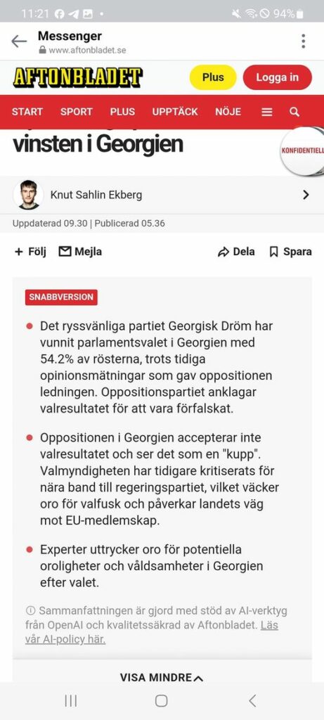 Nu är rösterna räknade och fördelade efter gårdagens parlamentsval i Georgien. Det står klart att det tidigare regeringspartiet Georgisk Dröm tar hem en majoritet med 54.2 procent av rösterna, enligt landets valmyndighet. 99,1 procent av alla röster räknade. Partiet har beskrivits som allt mer auktoritärt och har anklagats för att vara ryssvänligt. Partiets ledare Bidzina Ivanishvili är affärsman och miljardär. Han byggde sin förmögenhet i Ryssland under 1990-talet. Men de tidiga opinionssiffrorna i gårdagens val skiljde sig dramatiskt från det slutgiltiga resultatet. Prognosen visade att oppositionen hade ledningen, enligt en vallolaksunderöskning. Sedan vände det och regeringspartiet gick upp i topp. Oppositionen kallade valresultatet en ”kupp”. Valmyndigheten, CEC, har tidigare kritiserats för att stå för nära regeringen. – Vi kommer inte acceptera resultaten av detta förfalskade resultatet, säger oppositionspolitikern från Förenad nationell rörelse, Tina Bokuchava, till BBC. Det har av oppositionen beskrivits som ett ödesval för Georgien och ett val mellan Ryssland och Europa. Flera har bedömt det som det viktigaste valet sedan Georgien blev självständigt från Sovjetunionen 1991, rapporterar BBC. Risk för oroligheter Georgien fick kandidatstatus till EU i december i fjol. Men deras väg till medlemskap har kantats av regeringens politiska linje efter att man infört en ”agentlag” som liknandes med Rysslands lagstiftning. Lagen innebär att organisationer och medier som är delvis finansierade i utlandet ska registreras som att de verkar i främmande makts ärenden. Nu oroas experter för att oroligheter och våldsamheter kan uppstå i landet. Hugo von Essen är analytiker vid Centrum för Östeuropastudier. Han menar också att resultatet kommer vara oklart för en tid framöver. – Det finns också en risk att det kommer bli våldsamheter, säger han och fortsätter: – Om oppositionen och civilsamhället får veta, eller bara misstänker, att det förekommit fusk kommer det sannolikt leda till stora protester