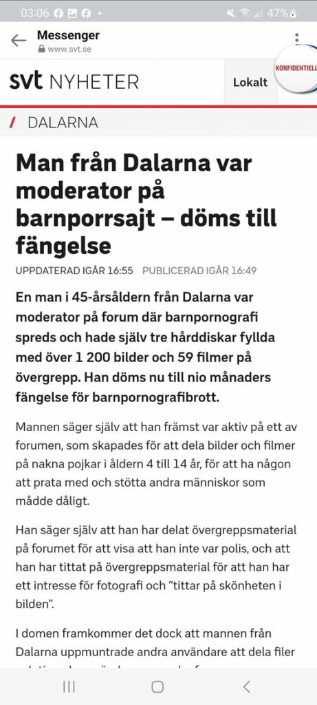 https://www.svt.se/nyheter/lokalt/dalarna/man-fran-dalarna-var-moderator-pa-barnporrsajt-doms-till-fangelse Man från Dalarna var moderator på barnporrsajt – döms till fängelse Uppdaterad igår 16:55Publicerad igår 16:49 En man i 45-årsåldern från Dalarna var moderator på forum där barnpornografi spreds och hade själv tre hårddiskar fyllda med över 1 200 bilder och 59 filmer på övergrepp. Han döms nu till nio månaders fängelse för barnpornografibrott. Mannen säger själv att han främst var aktiv på ett av forumen, som skapades för att dela bilder och filmer på nakna pojkar i åldern 4 till 14 år, för att ha någon att prata med och stötta andra människor som mådde dåligt. Han säger själv att han har delat övergreppsmaterial på forumet för att visa att han inte var polis, och att han har tittat på övergreppsmaterial för att han har ett intresse för fotografi och ”tittar på skönheten i bilden”. I domen framkommer det dock att mannen från Dalarna uppmuntrade andra användare att dela filer och tipsade användare om andra forum. På mannens hårddiskar fanns över sju timmar av övergreppsmaterial som bedöms som ”särskilt hänsynslöst.” Mannen har tidigare dömts för ofredande. Han är nu skriven på annan ort, men bodde i Dalarna när hårddiskarna hittades