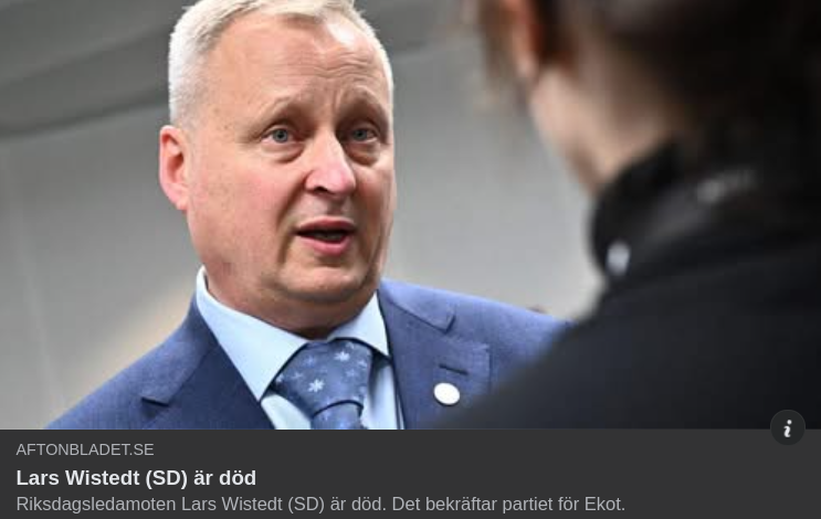 Riksdagsledamoten Lars Wistedt (SD) är död. Wistedt gick hastigt bort under en resa med Natodelegationen till Montreal i Kanada, natten till måndagen lokal tid, rapporterar Ekot. Wistedt var Sverigedemokraternas försvarspolitiska talesperson och vice ordförande i försvarsutskottet. I ett internt mejl till SD:s riksdagsgrupp, som Aftonbladet fått ta del av, skriver gruppledare Linda Lindberg att kollegan ”lämnar ett stort tomrum efter sig”. ”Jag har under dagen nåtts av det sorgliga beskedet att vår kära partikollega och vän Lars Wistedt har avlidit under sin resa i Kanada där han deltog som ledamot i Nato-delegationen”, skriver hon. ”Glad och lycklig igår” Hon fortsätter: ”Lars hittades stillsamt avliden i sin säng natten till idag, kanadensisk tid. Aron Emilsson som är på samma resa hälsar att de haft fina sista dagar tillsammans. Lars var glad och lycklig igår kväll och det fanns inga tecken på oro eller sjukdomsbild. Det är med oerhört tungt hjärta som jag informerar er alla om detta. Lars var en klippa, en fantastisk vän och en mycket kompetent kollega. Han kommer att vara oerhört saknad och han lämnar ett stort tomrum efter sig”. Lindberg avslutar med att skriva att man kommer hålla en minnesstund på tisdagens gruppmöte. Kondoleanser på sociala medier Flera politiker skriver om Wistedt på X. Jessica Stegrud, riksdagsledamot för SD, beskriver honom som ”oerhört sympatisk” ”Oerhört sorgligt och en förlust för oss alla men inte minst för hans nära och kära. Vila i frid”, skriver hon. Sveriges minister för civilt försvar, Carl-Oskar Bohlin (M), skriver också på X om kollegan. ”Mina tankar går till hans nära anhöriga och kolleger i riksdagen. Frid över hans minne”, skriver Bohlin. Hanna Gunnarsson, riksdagsledamot för Vänsterpartiet, är en annan som sörjer sin kollega. ”Chockerande att ta emot beskedet om att kollegan Lars Wistedt i försvarsutskottet har gått bort. Han var en omtyckt ledamot som gjorde stora insatser i utskottet och beredningen, otroligt kunnig och väldigt trevlig och lätt att umgås med”, skriver hon på X. Mötesdeltagare informerades På det aktuella mötet i Montreal deltar politiker från NATO-länder. Norrmannen Erlend Wiborg från Fremskrittspartiet är på plats med den norska delegationen. Han berättar att mötesdeltagarna blev informerade om dödsfallet från talarstolen, vid 20-tiden svensk tid. Det rapporterar Dagbladet. Lars Wistedt blev 60 år gammal."