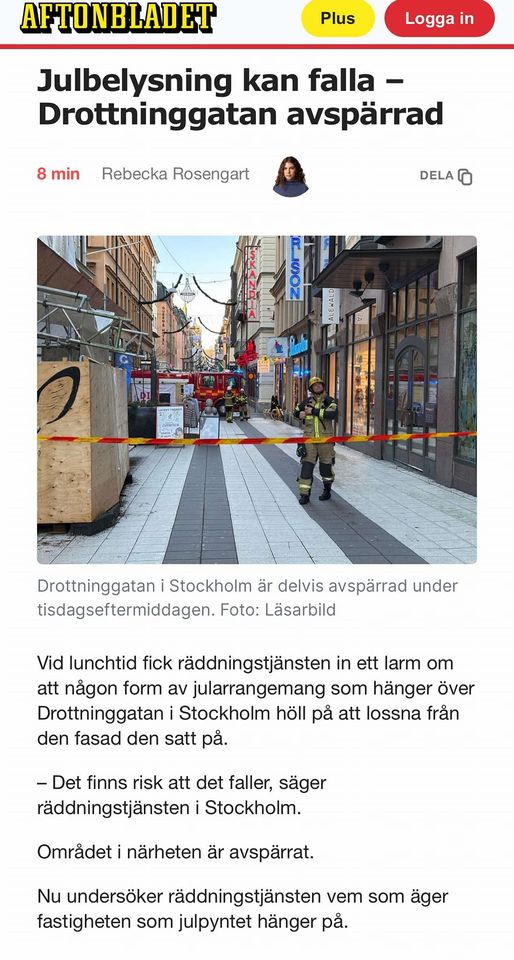 Drottninggatan Avspärrad För Julbelysningsnedfallningsrisk