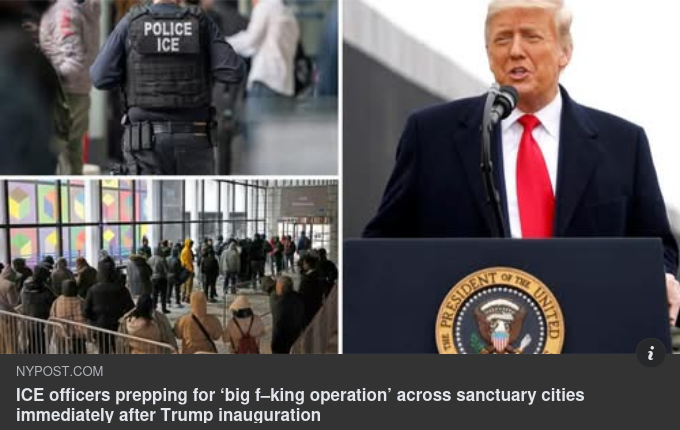 https://nypost.com/2025/01/17/us-news/ice-officers-prepping-for-big-f-king-operation-across-sanctuary-cities-after-trump-inauguration/ Immigrations- och tullmyndigheterna förbereder sig för att lansera en "stor f-king-operation" över helgedomsstäder - inklusive Chicago och New York - omedelbart efter den tillträdande presidenten Donald Trumps invigning , berättade flera källor för The Post. Från och med den 21 januari kommer flerdagars "markoperationer" att lanseras över städer som har fungerat som tillflyktsorter för migranter eftersom de lokala myndigheterna inte samarbetar med den federala regeringen när det kommer till immigrationsfrågor, sa källor. Tillträdande president Donald Trump talar under ett besök vid gränsmuren i Texas. Den tillträdande presidenten Donald Trump har lovat att genomföra ett historiskt antal utvisningar från och med den första dagen av hans presidentskap. Det massiva svepet kommer troligen att inriktas på personer med borttagningsorder, enligt källor. Trumps tillträdande gränstsar Tom Homan har lovat att massdeportationerna kommer att börja på dag 1 för att fokusera på illegala invandrare som utgör hot mot landet. En källa sa att vissa ICE-kontor redan har pausat arresteringar för att ge plats i interneringscentra för målen för de kommande razziorna. Den tidigare direktören för ICE:s kontor i Denver, John Fabbricatore, berättade för The Post att sådana svep avslutades under Biden-administrationen och tillade att "männen och kvinnorna i ICE ser fram emot att kunna göra sitt jobb" igen. Så många som 200 ICE-officerare kommer att utplaceras för att enbart utföra Chicago-operationen, rapporterade Wall Street Journal på fredagen . Trumps "gränstsar" val Tom Homan har lovat att översvämma ICE-tjänstemän till fristadsstäder. En talesperson för ICE avböjde att kommentera och hänvisade The Post till den inkommande administrationen "för all information om aktiviteter som kan äga rum efter invigningen." Trump-övergångsteamet svarade inte omedelbart på The Posts begäran om kommentar. I december berättade Homan för supportrar vid ett evenemang i Chicago att arresteringarna skulle börja i Windy City. "Chicago är i trubbel eftersom din borgmästare suger och din guvernör suger," sa Homan. Chicagos borgmästare Brandon Johnsons kontor svarade inte omedelbart på The Posts begäran om kommentar. Homan tillfrågades om rapporter om en "stor räd i Chicago" under ett framträdande på Fox News fredag kväll och signalerade att flera städer borde förvänta sig ICE-operationer efter Trumps invigning. "Det kommer att bli en stor räd över hela landet," sa den inkommande gränstsaren till Fox News-värden Jesse Watters. New Yorks borgmästare Eric Adams sätter sig ner med Trumps tillträdande gränstsar Tom Homan. "Chicago är bara en av många platser. Vi har 24 [ICE] fältkontor över hela landet. På tisdag ska ICE äntligen ut och göra sitt jobb. Vi ska ta av handbojorna från ICE och låta dem arrestera kriminella utlänningar. Det är vad som kommer att hända.” Homan tillade att ICE-agenter kommer att "upprätthålla immigrationslagstiftningen utan ursäkt" men "koncentrera sig på det värsta först." Han varnade dock att "ingen är utanför bordet." Nästan 230 000 migranter har inhysts i skattebetalarnas finansierade stadsskydd sedan floden av migranter började 2022. Robert Miller "Om de är i landet illegalt, har de ett problem," förklarade Homan. Homan träffade också nyligen New Yorks borgmästare Eric Adams, och de två diskuterade fristadsstäder, deportering av påstådda kriminella migranter och spårning av de mer än 320 000 saknade migrantbarnen , sa källor tidigare till The Post. Den tillträdande gränstsaren beskrev också Adams hållning i frågorna som en "fullständig 180" från hans tidigare progressiva invandringssyn. I en tidigare intervju med The Post, lovade Homan att inte skona fristadsstäder som skyddar illegala migrantbrottslingar från FB, och hotade potentiella stämningar och åtgärder för att undanhålla federal finansiering från dessa områden i landet. Men Homan lovade också att ICE under den nya administratören kommer att göra arresteringar i fristadsstäder på egen hand och sa: "Vi väntar tills de kommer ut ur fängelset, sedan går vi ut i stadsdelarna och hämtar dem." Tillsammans med de omedelbara ICE-svepen kommer det sannolikt att bli snabba och genomgripande förändringar vid gränsen. Trumps val att leda Department of Homeland Security, South Dakotas guvernör Kristi Noem, vittnade under sin utfrågning i senaten i fredags att dag 1-planerna inkluderar att skrota Biden-administrationens signatur CBP One-telefonapp för gränsinträde. Appen har tillåtit 936 500 migranter att planera sina gränsövergångar, enligt federala uppgifter."
