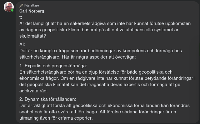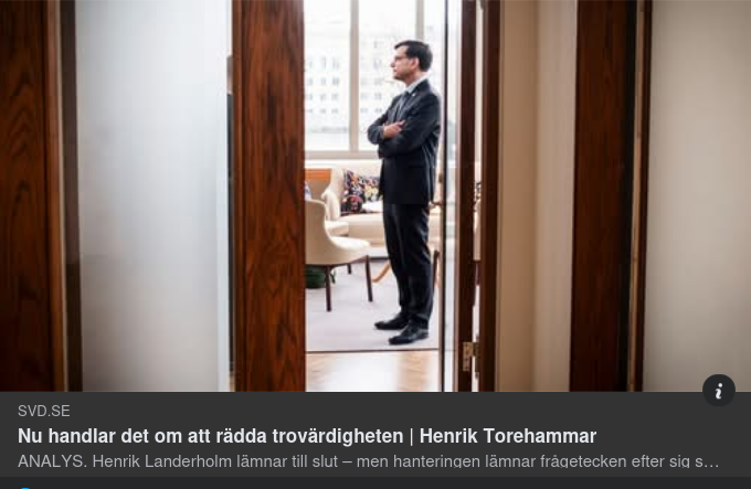 https://www.svd.se/a/4BGpVV/henrik-landerholm-avgar "Varför slutar Landerholm? En åklagare har inlett en förundersökning om den incident som skedde för två år sedan med kvarglömda papper på en kursgård. Efter samtal med statsministern konstaterar båda att det inte är möjligt att Landerholm är kvar. Med det mediala trycket har många spekulerat vad som skulle bli droppen som fick bägaren att rinna över. Journalister lyckades hitta andra nyheter som riktade ljuset mot Landerholms omdöme, som Aftonbladets rapportering om delvis privata resor till Berlin, där hans särbo då bodde, som skattebetalarna fick bekosta. När rättsväsendet nu tagit detta steg blev det helt enkelt för mycket. Oppositionsledaren Magdalena Andersson (S) uttryckte det som att i en orolig omvärld är det inte bra att den nationella säkerhetssamordnaren ägnar sin tid åt andra saker. Där tycks Kristersson ha instämt. Vad blir konsekvenserna för regeringen? Anna Kinberg Batra fick lämna sin landshövdingepost efter vad som beskrivits som kompisrekryteringar. Att Henrik Landerholm är statsministerns barndomsvän och bror till Moderaternas partisekreterare Karin Enström har väckt oönskade liknelser om hur M-eliten anställer. Landerholms grundkompetens har inte ifrågasatts, men hans omdöme. Där har särskilt den säkerhetspolitiska världen varit upprörd över Landerholms slarvighet. Vanliga väljare kanske reagerat mer på att den välbetalde nationella säkerhetsrådgivaren varit så om sig och kring sig att låta jobbet betala resor till flickvännen i Berlin. För Kristersson är det nog jobbigt på ett personligt plan, men nu har det handlat om att rädda regeringens trovärdighet. Vad händer nu? Statsministerns folk är noga med att påpeka att Landerholm inte får något avgångsvederlag eller hamnar på den så kallade elefantkyrkogården. Landerholm får en uppsägningstid på sex månader. Den skapelse som Landerholm togs in för att leda kommer fortleva under biträdande chefen. Ett försvar regeringen återkommit till är att regeringskansliets säkerhetsavdelning tidigare bedömt händelsen, och att det då inte landade i att ta vidare frågan rättsligt. Varför detta inte skedde är något som kan behöva utredas. Även om regeringen nu tycker att frågan är utredd är det långt ifrån säkert att oppositionen kommer att släppa den. Landerholm skriver själv på X: ”Jag hoppas att mina gärningar under snart 42 år i statens tjänst i sinom tid skall överskugga den bild som satts under den senaste månaden. Jag avser under den tid som rättslig prövning pågår inte uttala mig offentligt.”"